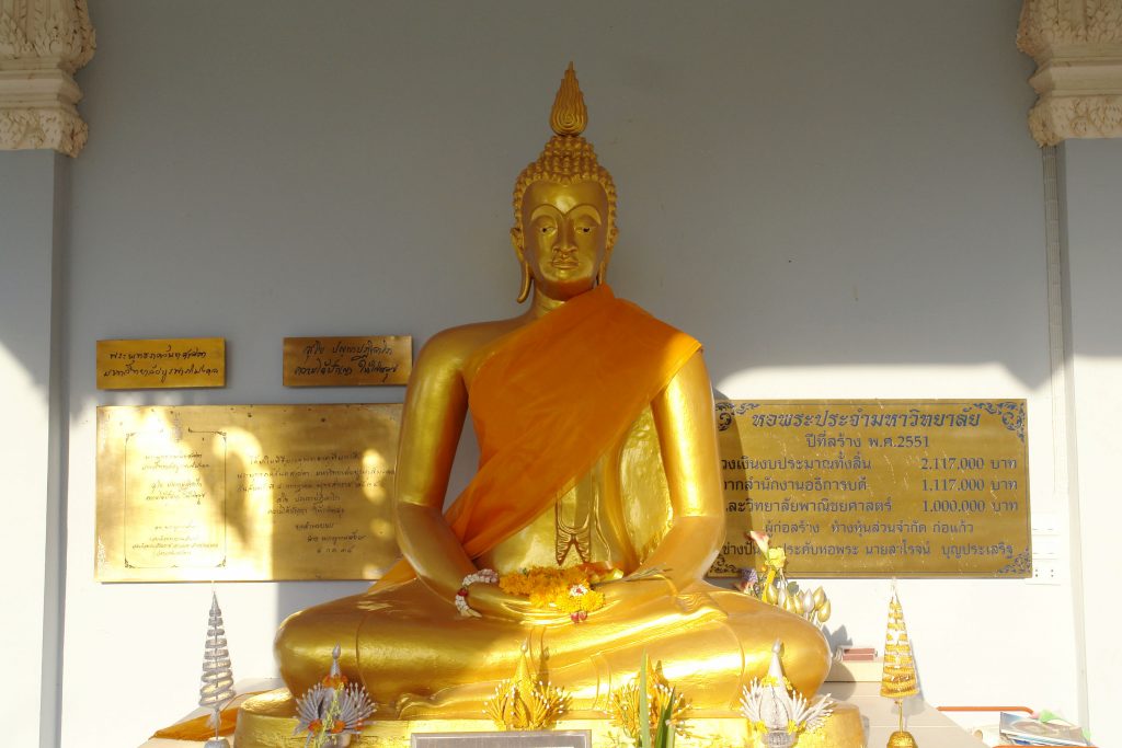 พระพุทธรูปประจำมหาวิทยาลัยองค์นี้ได้ทำพิธีรวมธาตุ สร้างขึ้นที่วัดเทพสุวรรณ ตำบลบ้านขวาง อำเภอมหาราช จังหวัดพระนครศรีอยุธยา เมื่อวันที่ ๑๐ ธันวาคม พ.ศ. ๒๕๓๑ เป็นองค์หนึ่งในจำนวน ๓๔ องค์ ซึ่งองค์พระมีน้ำหนักตันเศษ หน้าตัก ๓ ศอก สูง ๑๗๐ เซนติเมตร หนา ๘๐ เซนติเมตร พระบรมธาตุที่บรรจุในองค์พระพุทธรูป ได้รับมาจากท่านพระอาจารย์พระภาวนาพิศาลเถร (หลวงพ่อพุธฐานนิโย) วัดป่าสาลวัน อำเภอเมือง จังหวัดนครราชสีมา