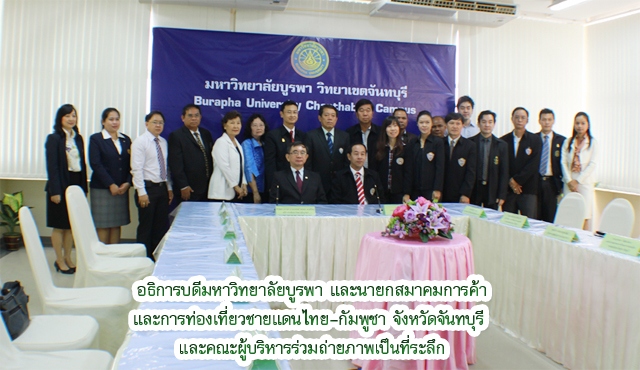 พิธีลงนามบันทึกข้อตกลงความร่วมมือทางวิชาการ ระหว่าง วิทยาลัยพาณิชยศาตร์ มหาวิทยาทลัยบูรพา กับ สหภาพแรงงานรัฐวิสาหกิจการไฟฟ้า ส่วนภูมิภาคเพื่อมาเรียนปริญญาโทบริหารธุรกิจ นำโดยศาสตราจารย์ ดร.สมพล พงศ์ไทย อธิการบดีมหาวิทยาลัยบูรพา ประธานในพิธีลงนาม ระหว่าง วิทยาลัยพาณิชยศาสตร์ มหาวิทยาลัยบูรพา โดย และสหภาพแรงงานรัฐวิสาหกิจการไฟฟ้าส่วนภูมิภาค โดยมีนายสุดเจริญ สมชม ประธานสหภาพแรงงานรัฐวิสาหกิจการไฟฟ้าส่วนภูมิภาค, นายกิตติภณ ทุ่งกลาง เลขาธิการสหภาพแรงงานรัฐวิสาหกิจการไฟฟ้าส่วนภูมิภาค, นายธนชัย ร้อยศรี รองประธานสหภาพแรงงานรัฐวิสาหกิจการไฟฟ้าส่วนภูมิภาค, ผู้ช่วยศาสตราจารย์ ดร.วิโรจน์ เรื่องประเทืองสุข รองอธิการบดีมหาวิทยาลัยบูรพา, ผู้ช่วยศาสตราจารย์ ดร.บรรพต วิรุณราช คณบดีวิทยาลัยพาณิชยศาสตร์ ร่วมในพิธี เมื่อวันที่ เมื่อวันที่ 19 มกราคม พ.ศ. 2554 ณ ห้องประชุมชั้น 8 วิทยาลัยพาณิชยศาสตร์ มหาวิทยาลัยบูรพา ” ]