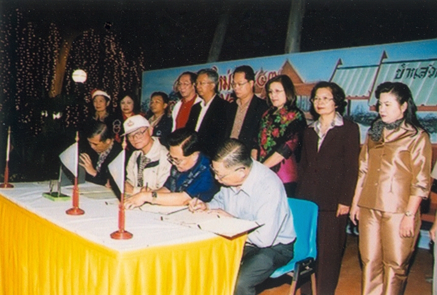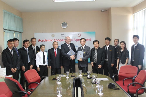 พิธีลงนามบันทึกข้อตกลงความร่วมมือทางวิชาการ ระหว่าง สถาบันเทคโนโลยีพระจอมเกล้าเจ้าคุณทหารลาดกระบัง กับ มหาวิทยาลัยบูรพา นำโดย ศ.ดร.สุชาติ อุปถัมภ์ อธิการบดีมหาวิทยาลัยบูรพา และรศ.ดร.กิตติ ตีรเศรษฐ อธิการบดีสถาบันเทคโนโลยีพระจอมเกล้าเจ้าคุณทหารลาดกระบัง ได้เซ็นสัญญาลงนามความร่วมมือทางวิชาการร่วมกัน ณ ห้องประชุม ชั้น 6 สำนักงานอธิการบดี สถาบันเทคโนโลยีพระจอมเกล้าเจ้าคุณทหารลาดกระบัง โดยมี รศ.ดร.เรณา พงษ์เรืองพันธุ์ รองอธิการบดีฝ่ายวิชาการ ลงนามเป็นสักขีพยานฝ่ายมหาวิทยาลัยบูรพา รศ.ดร.รัตติกร วรากูลศิริพันธุ์ รองอธิการบดีสถาบันเทคโนโลยีพระจอมเกล้าเจ้าคุณทหารลาดกระบัง ลงนามเป็นสักขีพยานฝ่ายสถาบันเทคโนโลยีพระจอมเกล้าเจ้าคุณทหารลาดกระบัง การลงนามความร่วมมือทางวิชาการในครั้งนี้ ทั้งสองฝ่ายได้ตกลงเห็นชอบร่วมกันที่จะส่งเสริมความร่วมมือทางวิชาการ เพื่อเพิ่มขีดความสามารถในการพัฒนาองค์ความรู้ การพัฒนางานวิจัยการบริการวิชาการ การพัฒนาศักยภาพของอาจารย์ ตลอดจนการพัฒนาการเรียนการสอนและกิจกรรมของนักศึกษา เมื่อวันที่ 12 พฤศจิการยน พ.ศ. 2552 ” ]