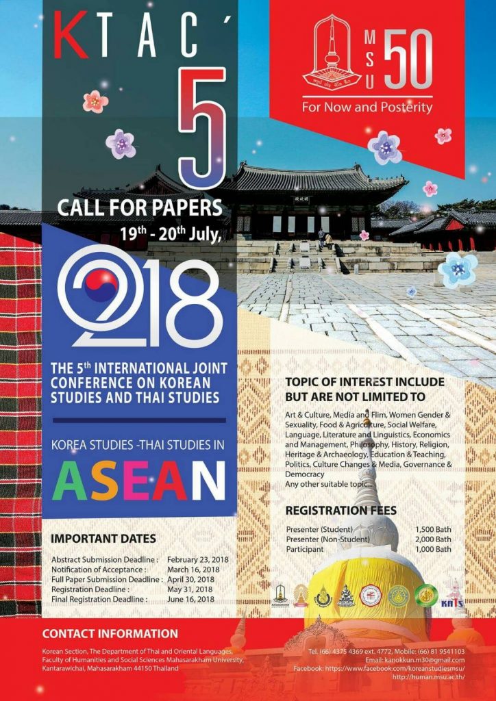 ศูนย์เกาหลีศึกษา คณะมนุษยศาสตร์และสังคมศาสตร์ มหาวิทยาลัยบูรพา ร่วมกับคณะมนุษยศาสตร์และสังคมศาสตร์ มหาวิทยาลัยมหาสารคาม คณะมนุษยศาสตร์และสังคมศาสตร์ มหาวิทยาลัยสงขลานครินทร์ วิททยาเขตปัตตานี คณะมนุษยศาสตร์ มหาวิทยาลัยรามคำแหง คณะมนุษยศาสตร์ มหาวิทยาลัยศรีนครินทรวิโรฒ สมาคมไทยศึกษาแห่งสาธารณรัฐเกาหลี และคณะบัณฑิตวิทยาลัย จุฬาลงกรณ์มหาวิทยาลัย กำหนดจัดงานประชุมวิชาการนานาชาติเกาหลีศึกษา-ไทยศึกษา ครั้งที่ 5 ในหัวข้อ “Korean Studies Thai Studies in ASEAN” ระหว่างวันที่ 19-20 กรกฎาคม 2561 ณ มหาวิทยาลัยมหาสารคาม สอบถามเพิ่มเติมที่ ศูนย์เกาหลีศึกษา คณะมนุษยศาสตร์และสังคมศาสตร์ โทร.0-3810-2322