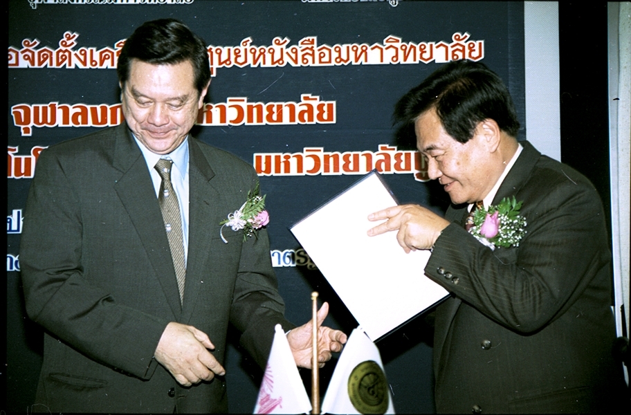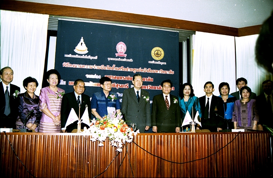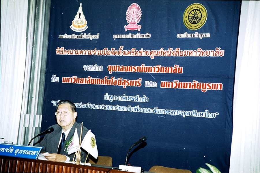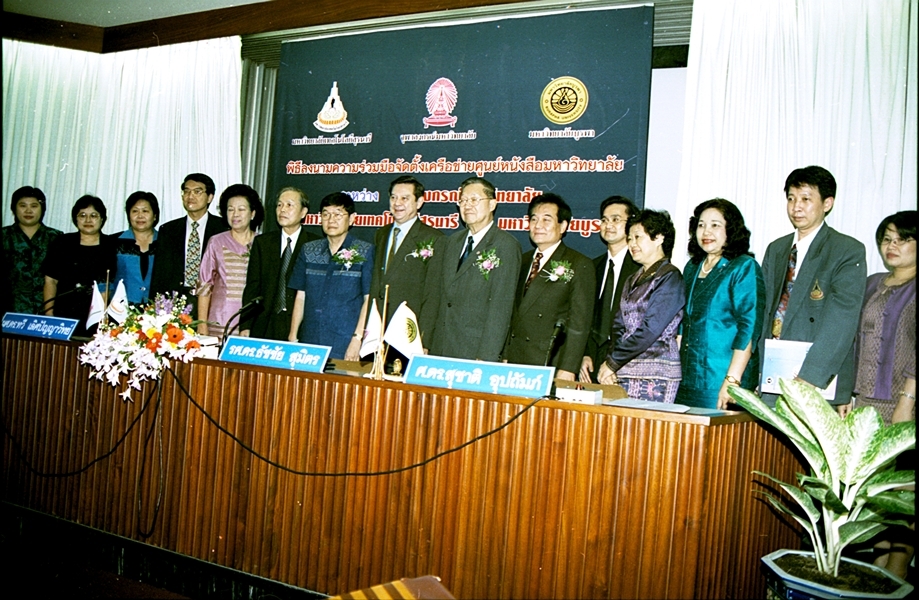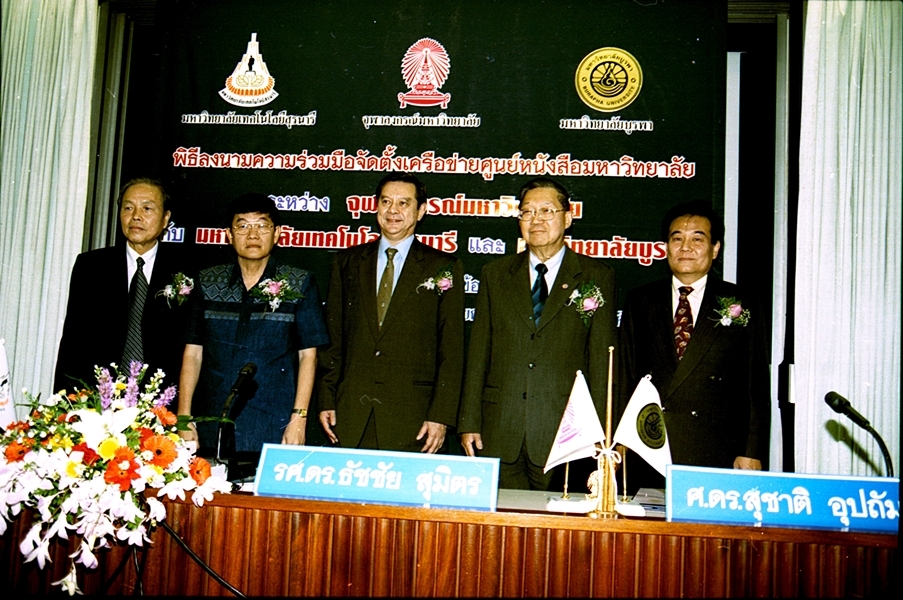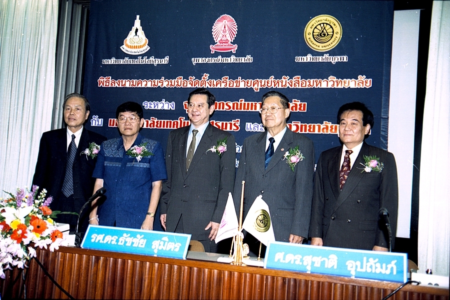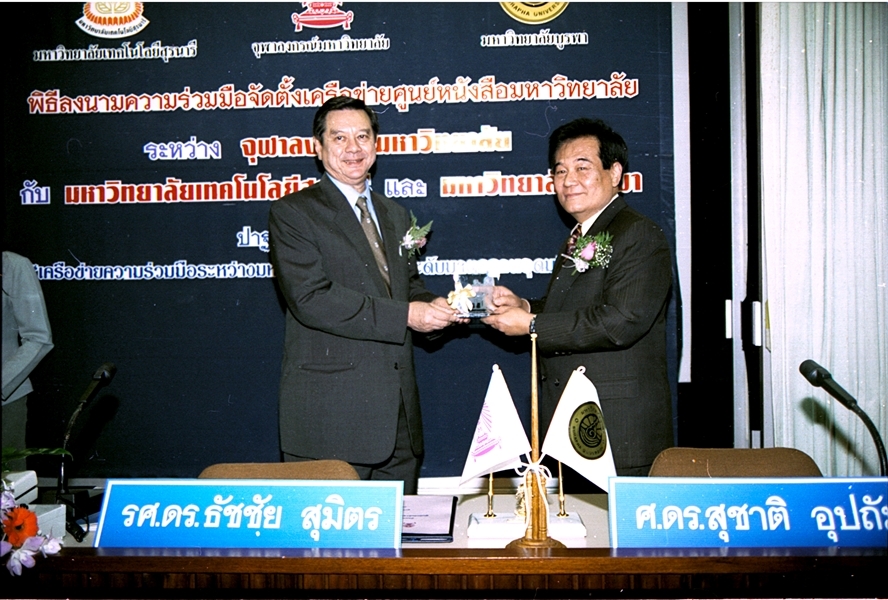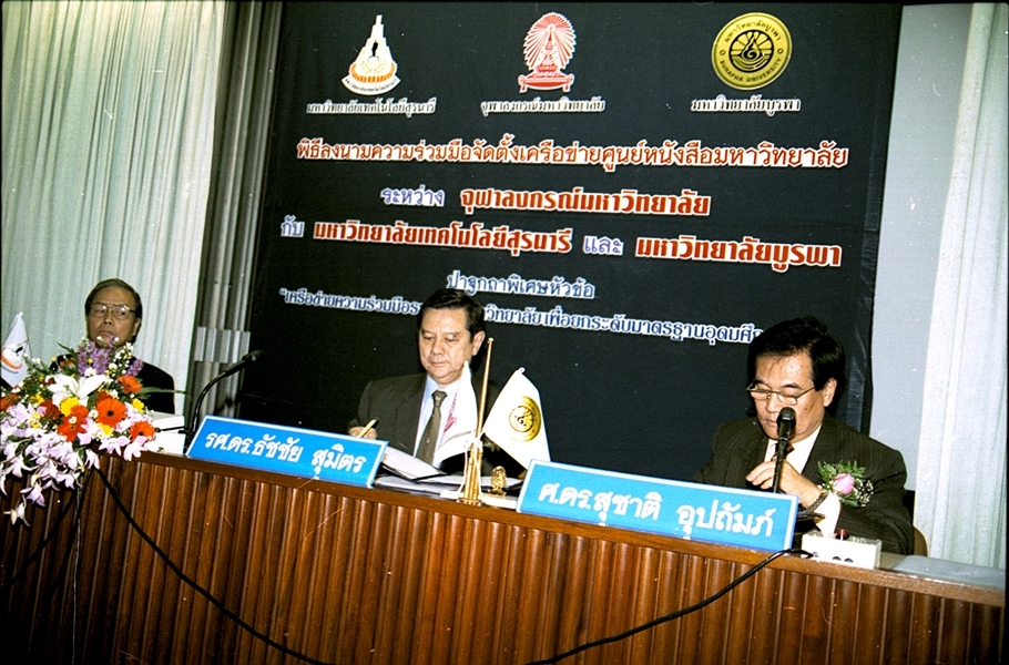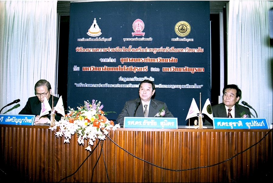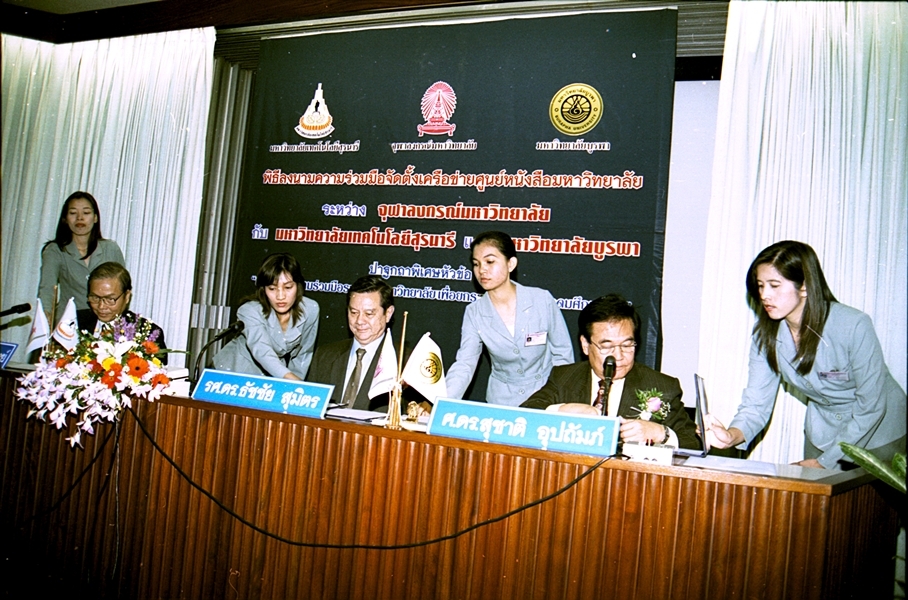 พิธีลงนามบันทึกข้อตกลงความร่วมมือทางวิชาการจัดตั้งเครือข่ายศูนย์หนังสือมหาวิทยาลัย ระหว่าง มหาวิทยาลัยเทคโนโลยีสุรนารี และ มหาวิทยาลัยบูรพา เมื่อวันที่ ๒๗ กันยายน พ.ศ. ๒๕๔๖