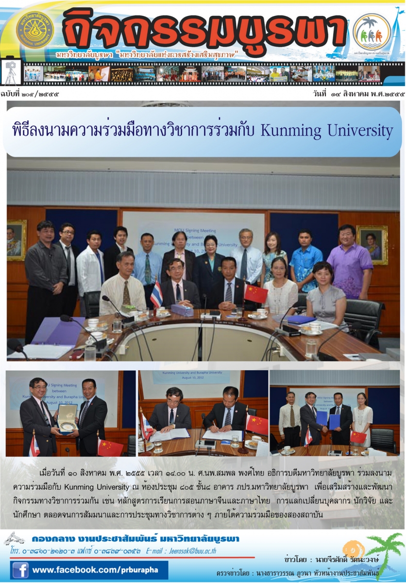 พิธีลงนามบันทึกข้อตกลงความร่วมมือทางวิชาการ ระหว่าง มหาวิทยาลัยบูรพา กับ Kunming University นำโดย ศาสตราจารย์ นายแพทย์สมพล พงศ์ไทย อธิการบดีมหาวิทยาลัยบูรพา ร่วมลงนามความร่วมมือ เพื่อเสริมสร้างและพัฒนากิจกรรมทางวิชาการร่วมกัน เมื่อวันที่ ๑๐ สิงหาคม พ.ศ. ๒๕๕๕ ณ ห้องประชุม ๘๐๕ ชั้น ๘ อาคาร ภปร. มหาวิทยาลัยบูรพา