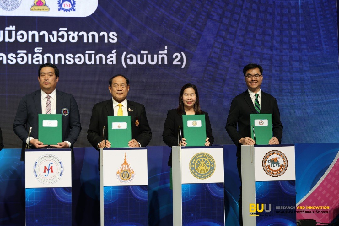พิธีลงนามบันทึกข้อตกลงความร่วมมือทางวิชาการ ในการส่งเสริมและสนับสนุนทางวิชาการด้านไมโครอิเล็กทรอนิกส์ มหาวิทยาลัยบูรพา โดยมีรองศาสตราจารย์ ดร.จิตติมา เจริญพานิช รองอธิการบดีฝ่ายวิจัยและนวัตกรรม มหาวิทยาลัยบูรพา เป็นผู้แทนมหาวิทยาลัยบูรพา พร้อมด้วย ผู้ช่วยศาสตราจารย์ ดร.ณัฐพล ชมแสง รองคณบดีฝ่ายวิจัยบริการวิชาการและนวัตกรรม และผู้ช่วยศาสตราจารย์ ดร.อานุภาพ บุญส่งศรีกุล คณะวิศวกรรมศาสตร์ ร่วมลงนามบันทึกข้อตกลงความ
