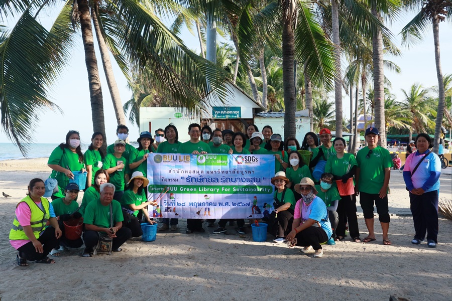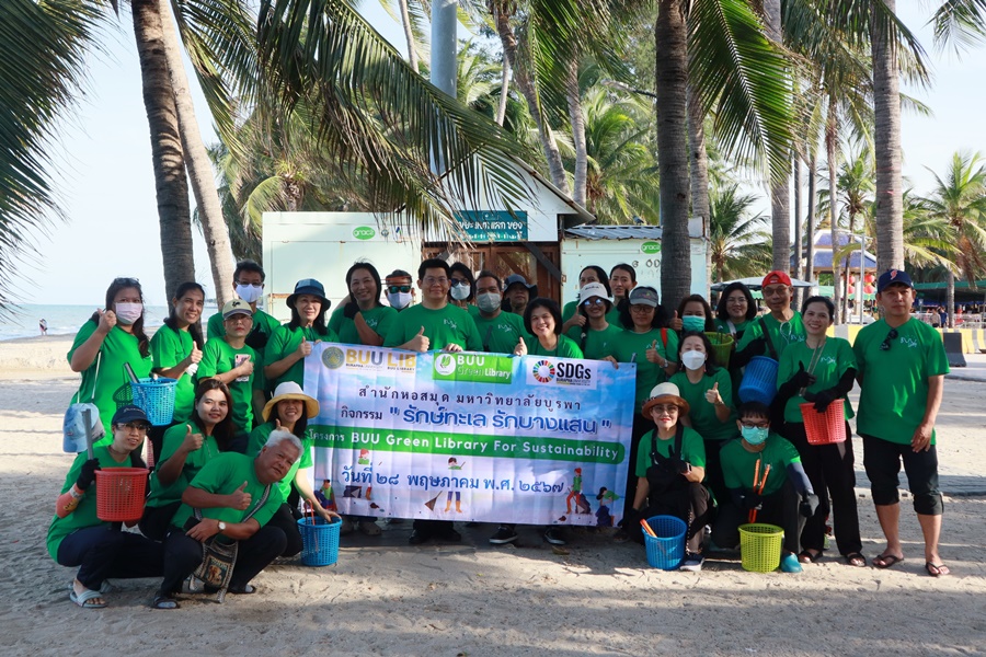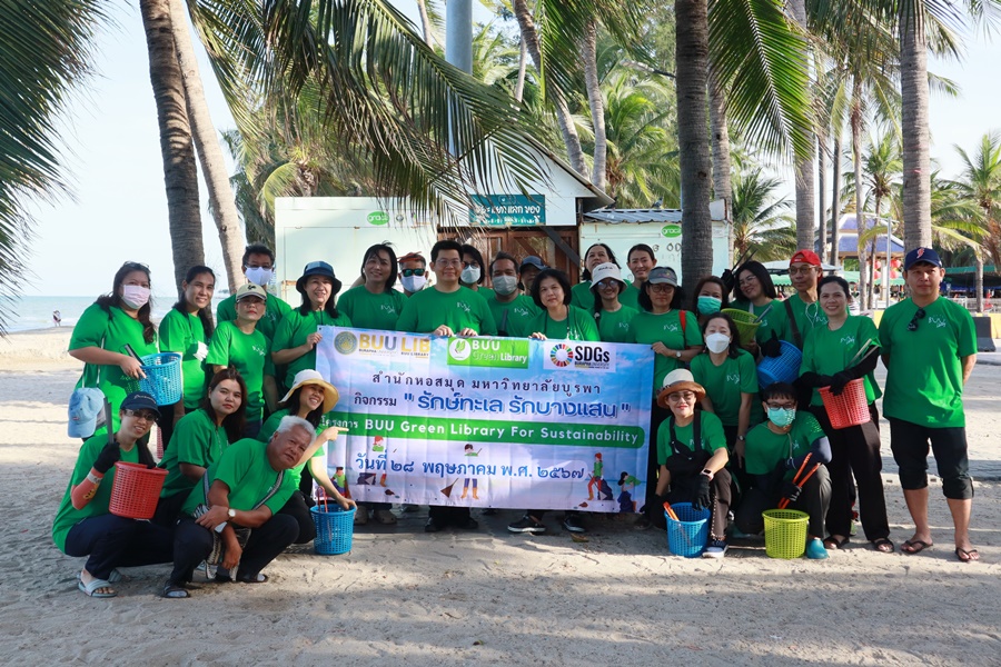 Burapha University Library led by Mr. Hemmarat Wachirahattapong, the Director of BUU Library, and the staff, participated in a beach cleanup at Bangsaen Beach under “Love the Sea, Love Bangsaen” activity. This activity aimed to keep Bangsaen Beach beautiful and clean under BUU Green Library For Sustainability project. The event took place on 28 May 2024, starting at 7:00 AM, near pier area of Chao Pho Saen Shrine at Bangsaen Beach, Chonburi.