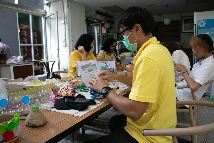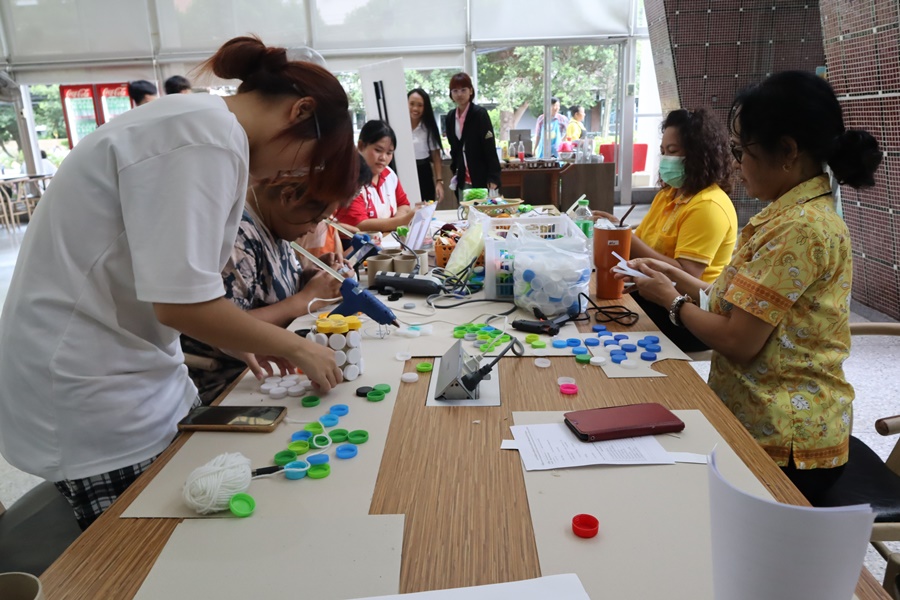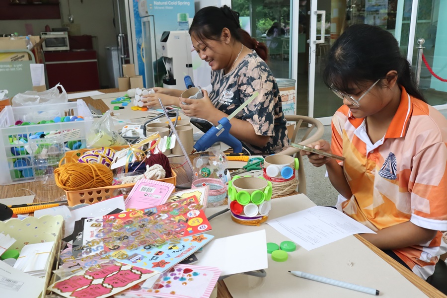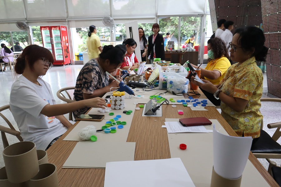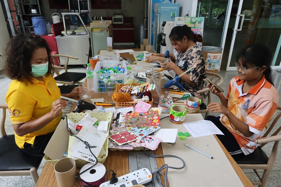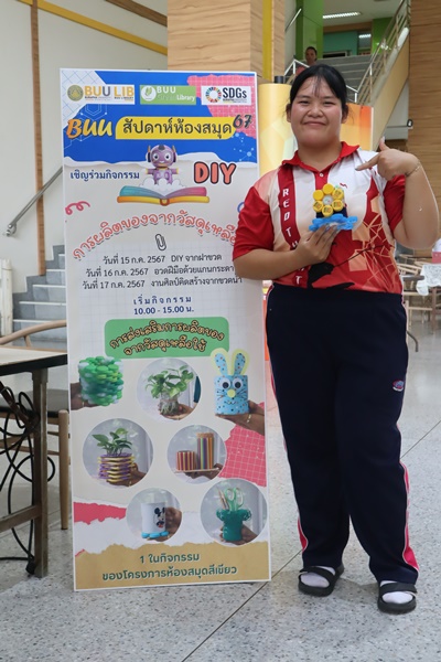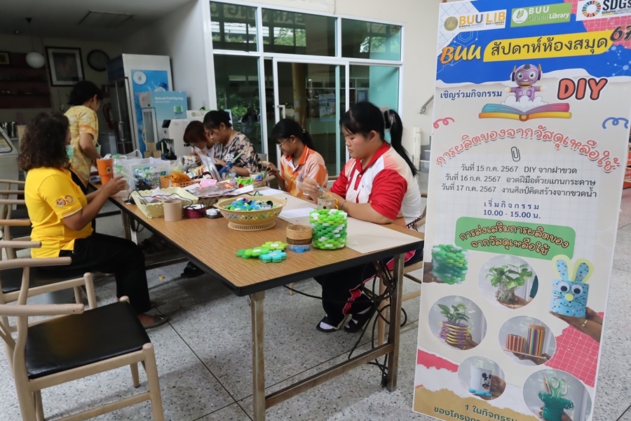 Burapha University Library organized a DIY craft-making activity using recycled materials. This activity was part of Green Library during Library Week 2024. The aim was to promote creative reuse of waste materials. Participants had the opportunity to create beautiful and practical items which they could take home after completion. The event was held on 15 July 2024 at the common learning hall on the 1st floor of the library.