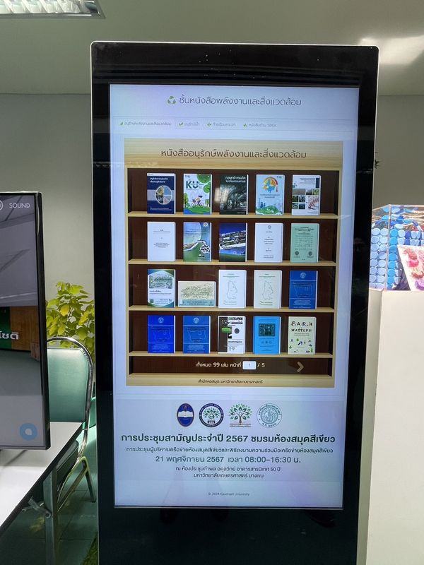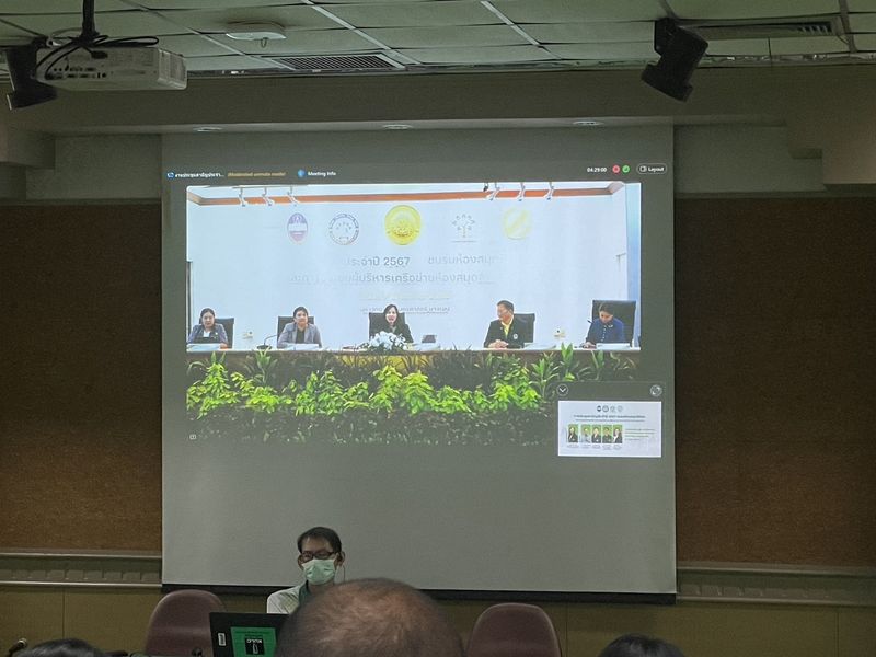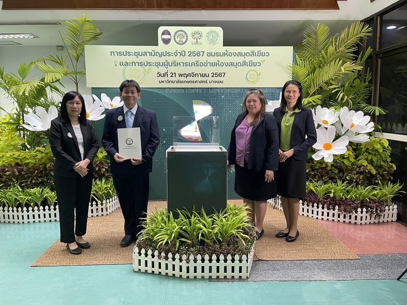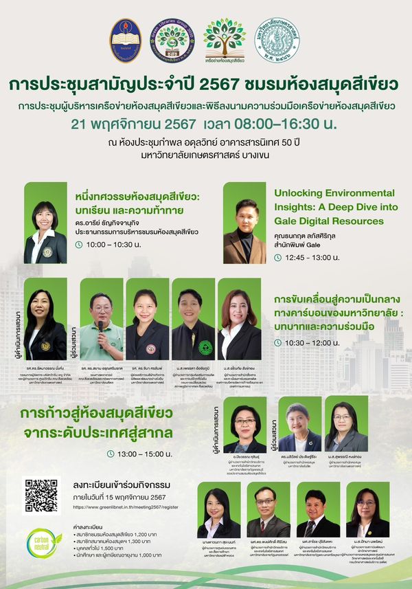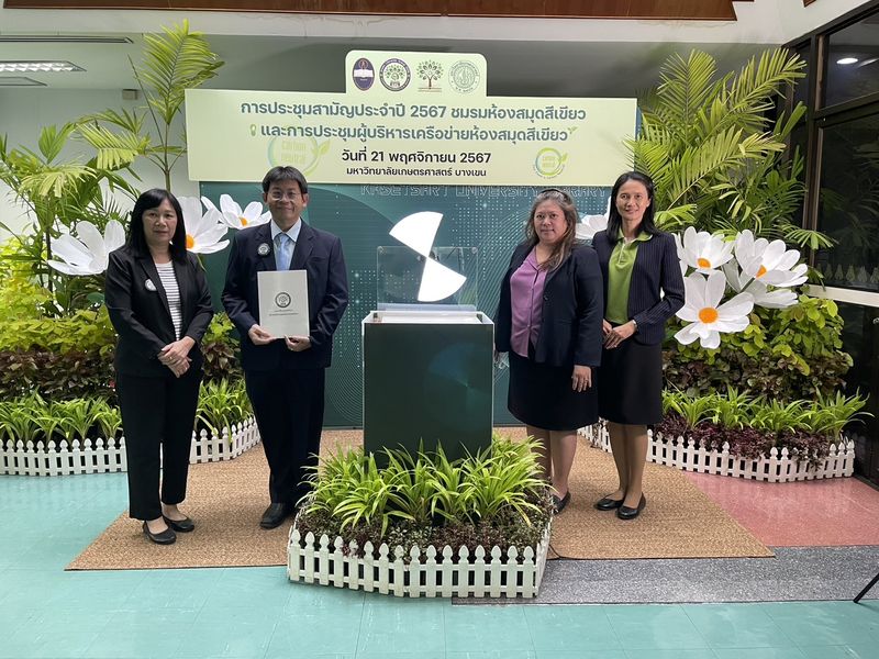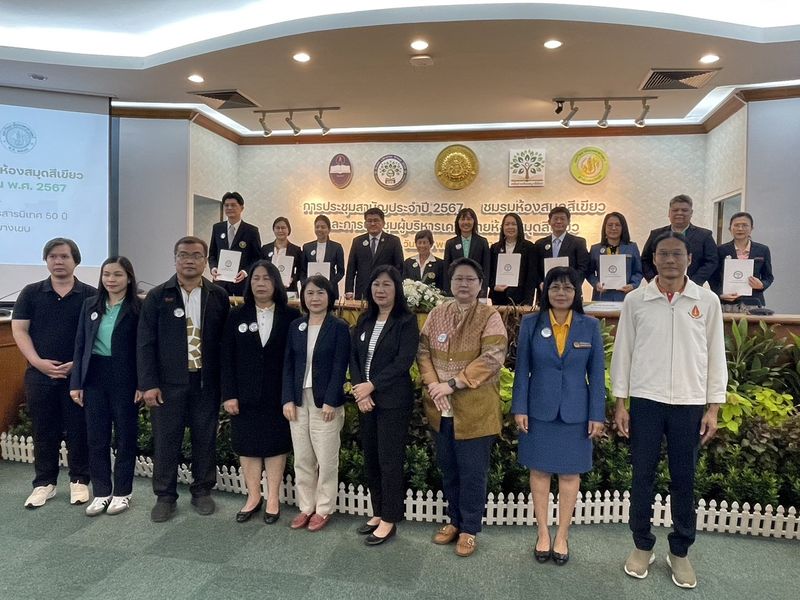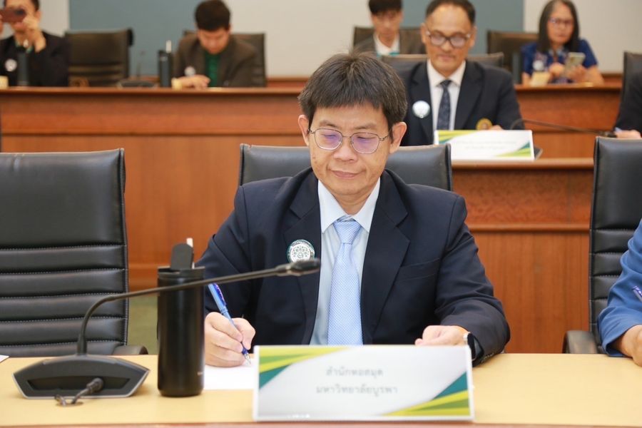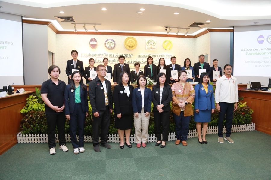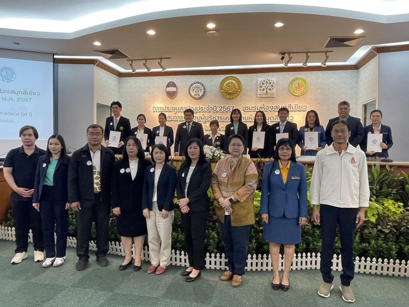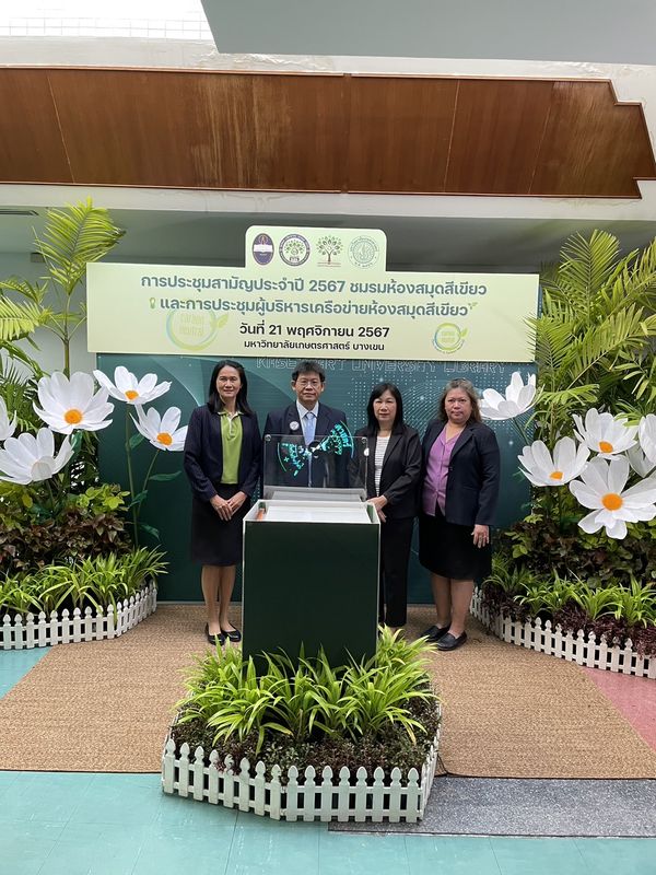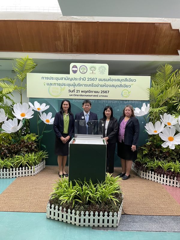 Executives and staff of Burapha University Library, led by Lec. Hemmarat Wachirahatthapong, the director of the library, participated in the 2024 Annual General Meeting 2024 Green Library Club, Green Library Network Executive meeting, and signing ceremony of the Memorandum of Understanding between Green Library Network and Thai Library Association under the Royal Patronage of Her Royal Highness Princess Maha Chakri Sirindhorn. The event was held on 21 November 2024, at the Kamphol Adulwit meeting room at the 50th Anniversary Information Building, Kasetsart University, Bangkhen Campus.