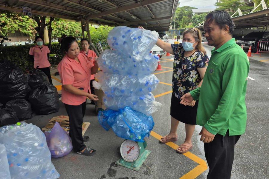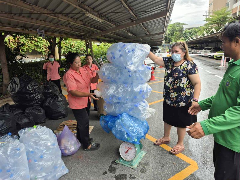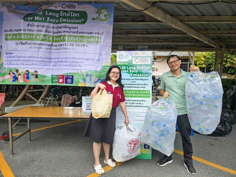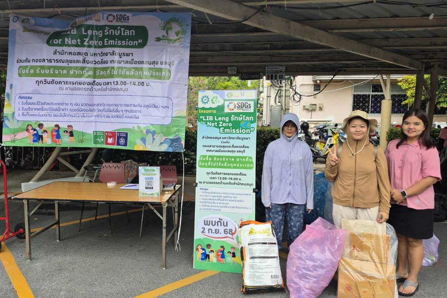 Burapha University Library, in collaboration with the Division of Public Health and Environment, San Suk Municipality, organized the “Lib Leng Saves the World for Net Zero Emission” project for the month of September on September 2, 2025. The activity included collecting, purchasing, donating, and accepting various types of unused materials. The event took place at the parking area behind the library.