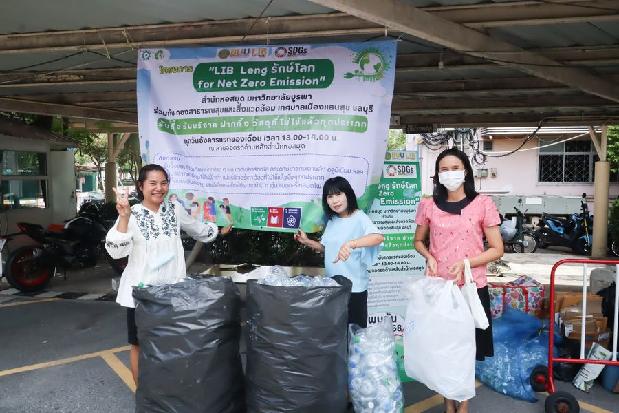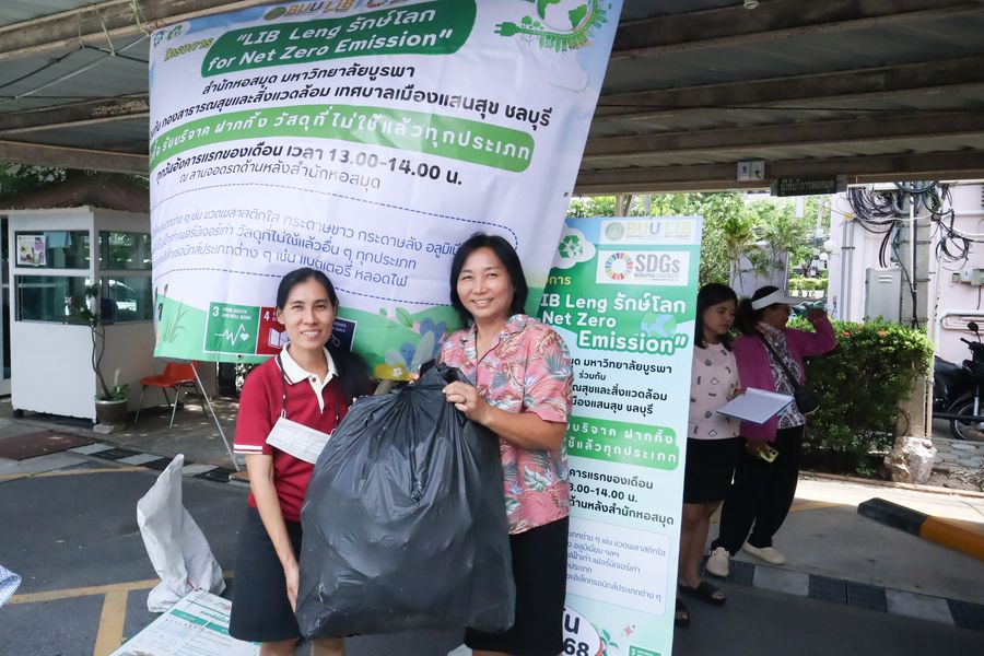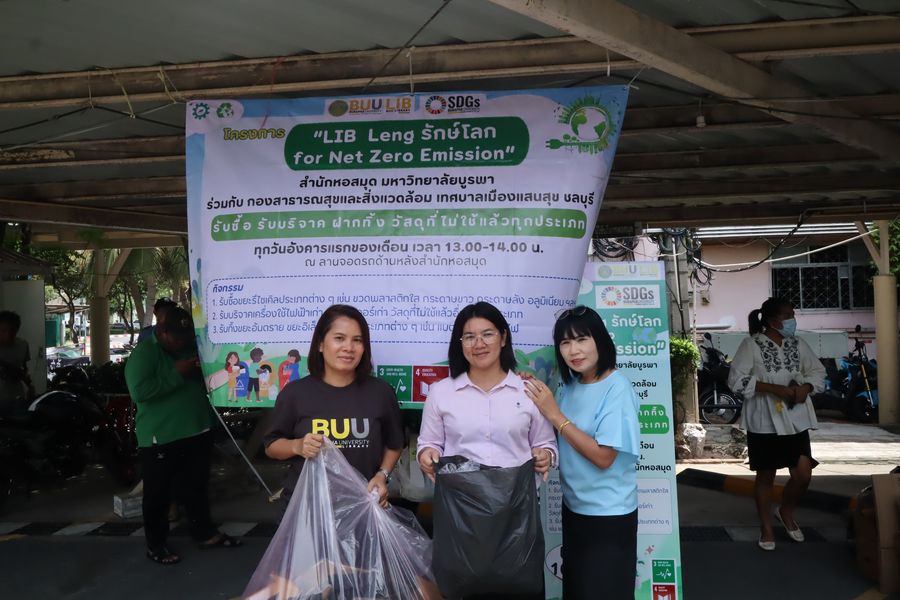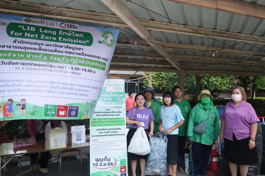 สำนักหอสมุด ร่วมกับกองสาธารณสุขและสิ่งแวดล้อม เทศบาลเมืองแสนสุขมารับซื้อรับบริจาค รับฝากทิ้งวัสดุที่ไม่ใช้แล้วทุกประเภท ในโครงการ Lib Leng รักษ์โลก for Net Zero Emission ประจำเดือนมิถุนายน เมื่อวันที่ 10 มิถุนายน 2568 ณ ลานจอดรถด้านหลังสำนักหอสมุด