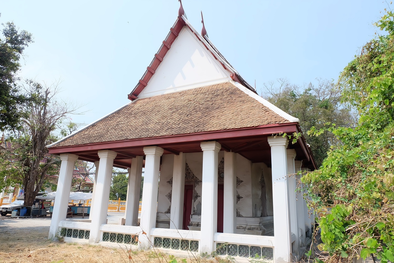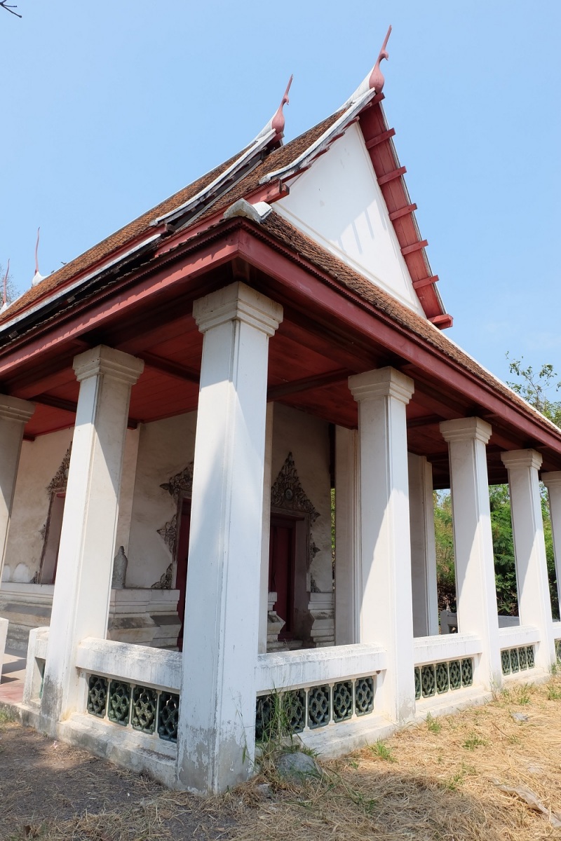 หลักฐานทางโบราณคดีที่สำคัญของวัดบางเป้ง คือ พระอุโบสถ (หลังเก่า) ลักษณะทางสถาปัตยกรรมเป็นอาคารอิฐถือปูน ผังรูปสี่เหลี่ยมผืนผ้า หลังคาเครื่องไม้มุงกระเบื้องดินเผา ลดชั้น ๒ ชั้น ด้านสกัดหน้า-หลังชักปีกนกยื่นออกมาบรรจบกับตับหลังคาด้านข้างคลุมโดยรอบอาคาร มีเสาซีเมนต์ตั้งรับชายคาเป็นระยะ ระหว่างเสาด้านล่างมีพนักลูกกรงก่ออิฐถือปูน เครื่องลำยองเป็นกรอบจั่วอย่างไทยช่อฟ้า ใบระกาหางหงส์ไม้ หน้าบันเป็นแบบชนิดไม่มีหน้าบันชั้นลด ตกแต่งด้วยลวดลายปูนปั้นประดับเครื่องถ้วยจีน และชุดลายครามจากต่างประเทศ ระหว่างเสาพาไลทำพนักระเบียงก่ออิฐกรุด้วยกระเบื้องปรุสีแบบจีน มีทางเข้าด้านข้างเหนือ-ใต้ ด้านละ ๒ ช่อง พระอุโบสถก่ออิฐถือปูนมีฐานปัทม์รองรับ ที่มุมยกเก็จขึ้นเป็นที่ประดิษฐานใบเสมาหินแกรนิต ด้านหน้ามีประตูเข้า-ออก ๒ ช่อง ผนังด้านข้างมีหน้าต่างด้านละ ๔ ช่อง บานประตูหน้าต่างไม้ทาสีแดง ซุ้มประตูและหน้าต่างทรงกรอบซุ้มมีปูนปั้นที่เป็นลวดลายประดับดอกและใบอย่าวเทศตกแต่งด้วยเครื่องถ้วยลายคราม