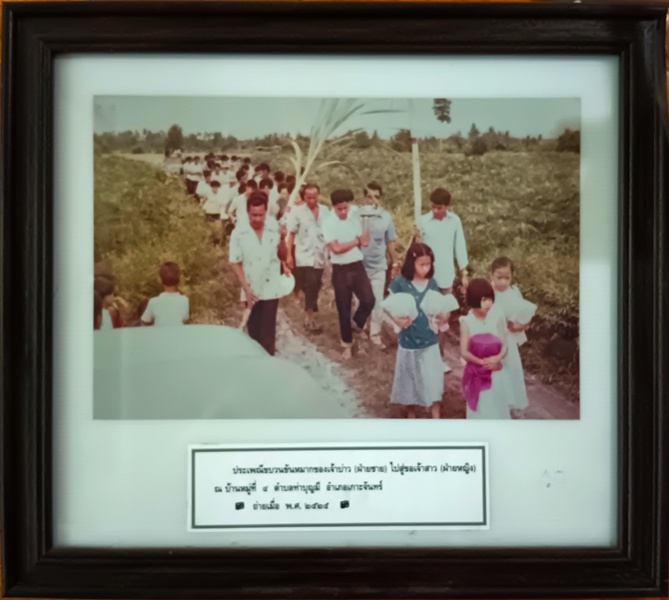 ประเพณีขบวนขันหมากของเจ้าบ่าว (ฝ่ายชาย) ไปสู่ขอเจ้าสาว (ฝ่ายหญิง) ณ บ้านหมู่ที่ ๔ ตำบลท่าบุญมี อำเภอเกาะจันทร์ ถ่ายเมื่อ พ.ศ. ๒๕๒๕