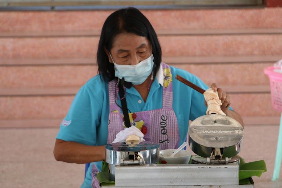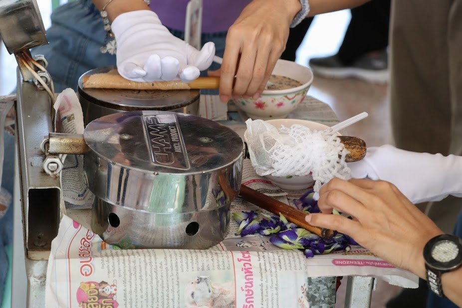 ๕. เตรียมอุปกรณ์สำหรับทำทองม้วน เปิดแก๊สใช้ไฟอ่อน วางพิมพ์ทองม้วนลงไป ทาด้วยน้ำมันพืชบาง ๆ ทั้งด้านบน และด้านล่าง วอร์มให้พิมพ์ร้อน