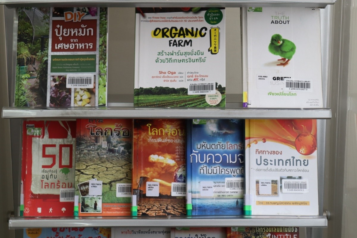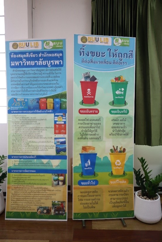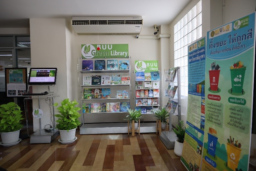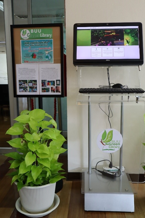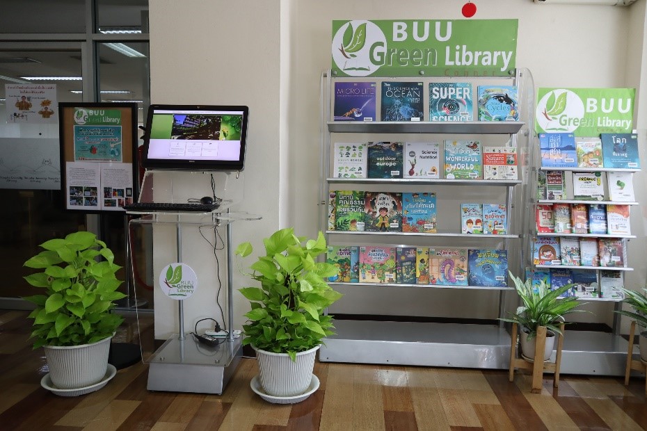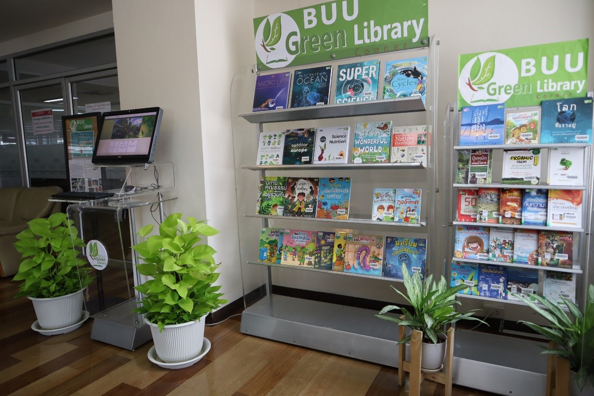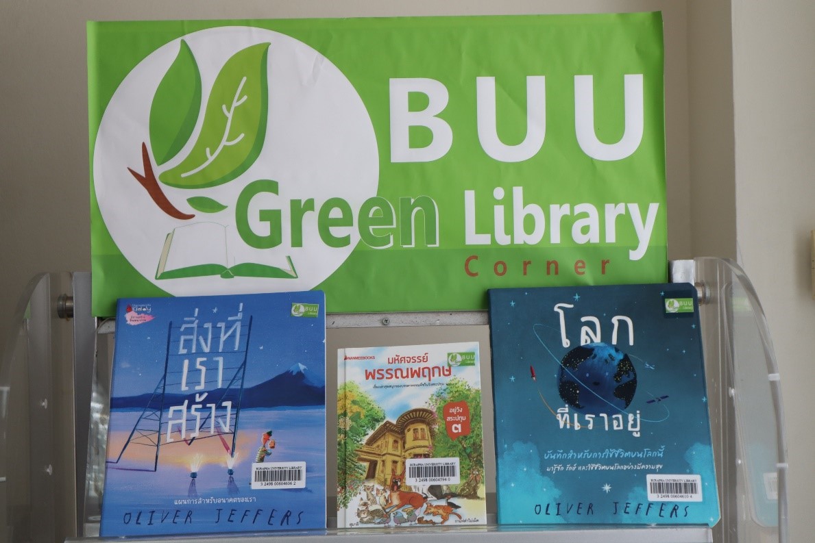 มุม Buu Green library สำนักหอสมุดจัดทำ มุม Buu Green library เพื่อรวบรวมทรัพยากรสารสนเทศที่เกี่ยวกับสิ่งแวดล้อมและการอนุรักษ์พลังงาน โดยนำเสนอแบบหมุนเวียน ให้บริการแก่ผู้ใช้บริการที่ชั้น 3 นอกจากนี้ยังได้มีการแนะนำข่าวสารสิ่งแวดล้อมและกิจกรรมต่างๆ ที่เกี่ยวข้องกับสิ่งแวดล้อมของสำนักหอสมุด
