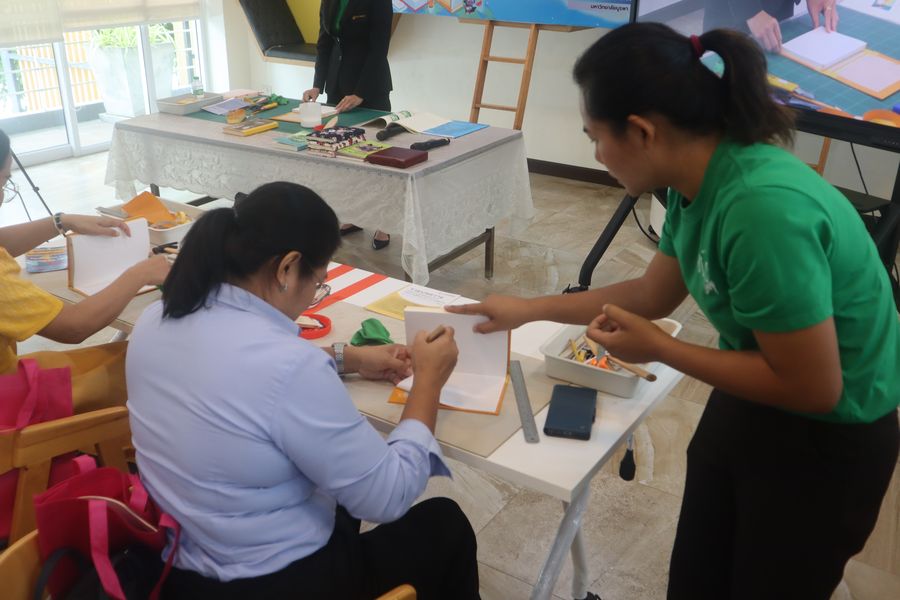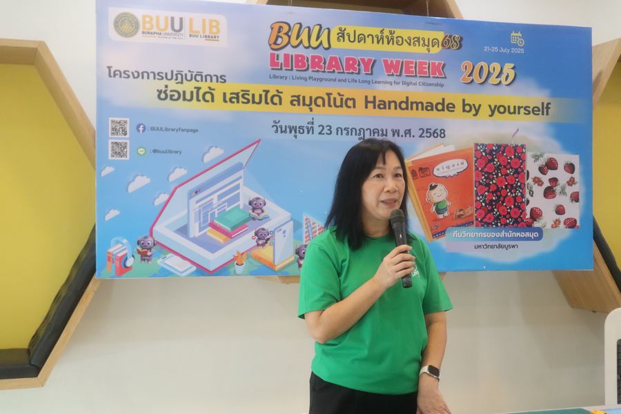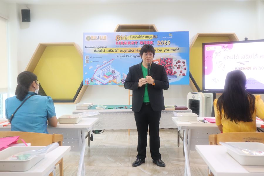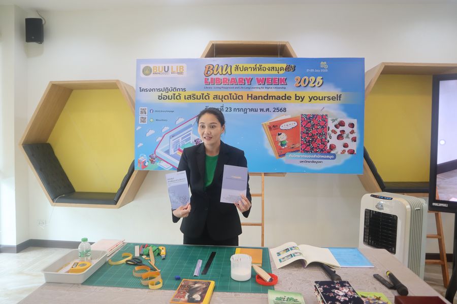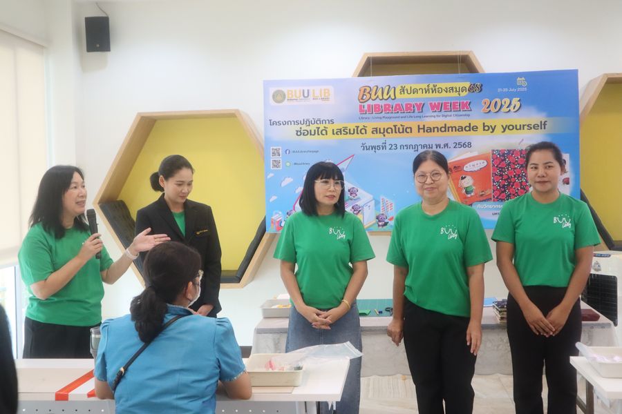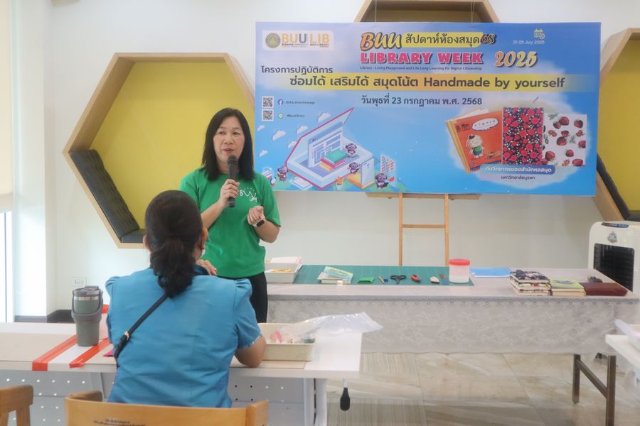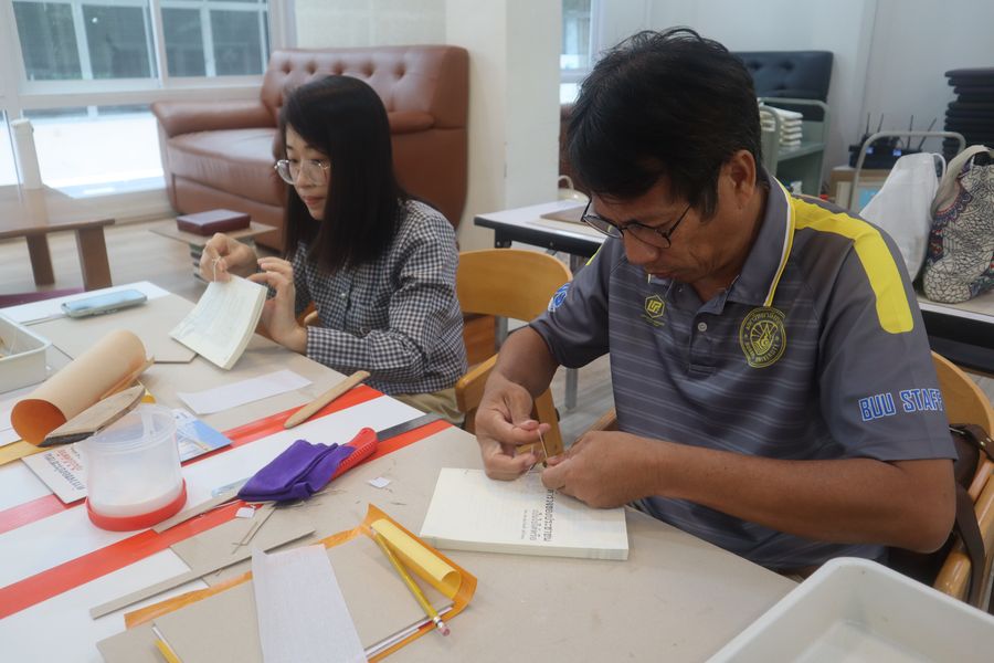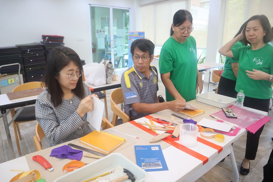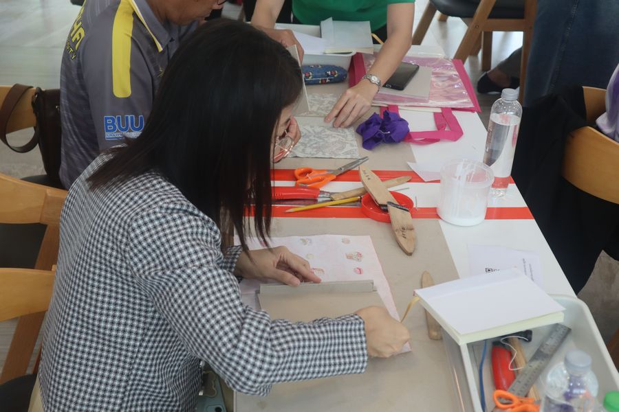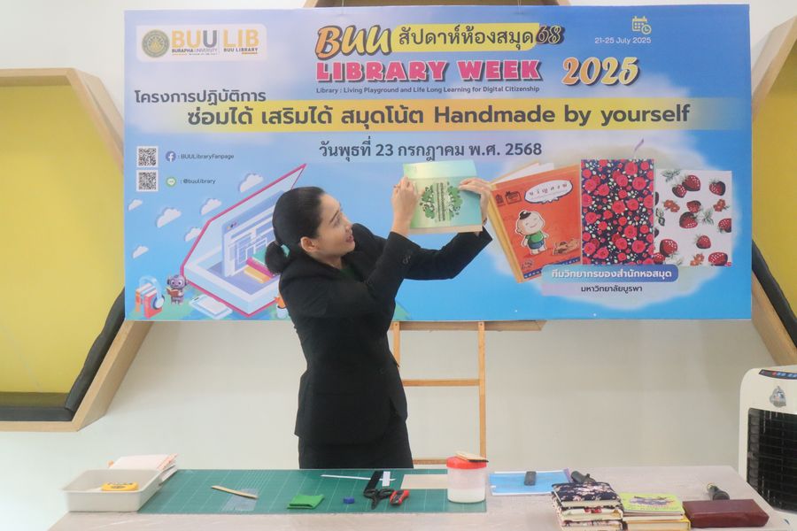 Burapha University Library, led by Mr. Hemmarat Wachirahattapong, the Director of the BUU Library, presided over the opening of the Workshop on “Repairable, Extendable: Handmade Notebook by Yourself.” The workshop was conducted by the library’s expert team from Burapha University. The event took place on July 23, 2025, at Khao Lam Game Zone on the 2nd floor at Lan Rommanee Building of the library.