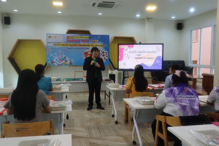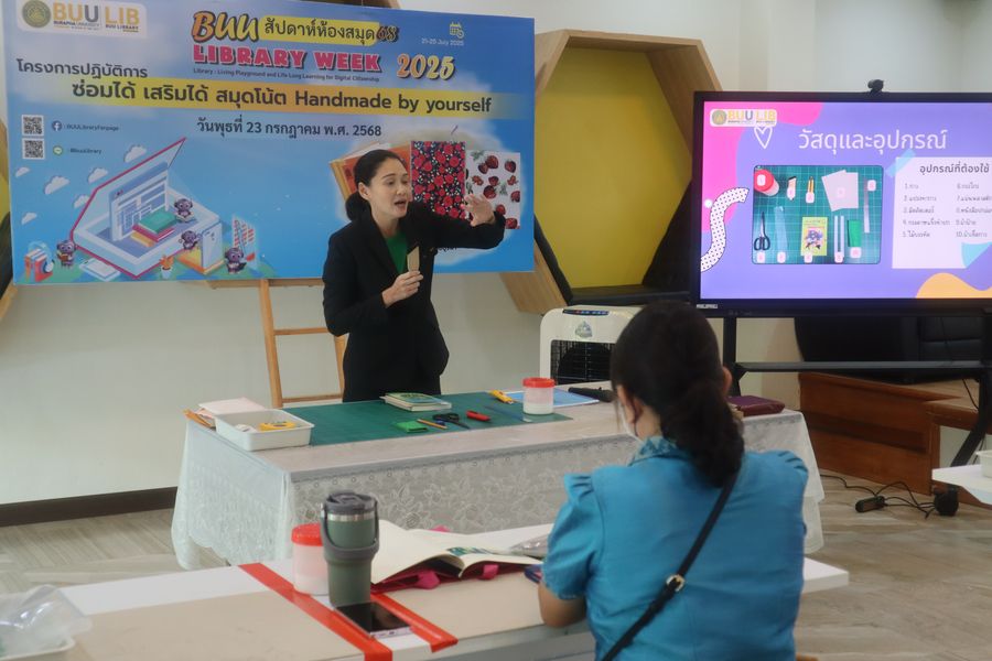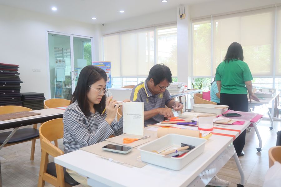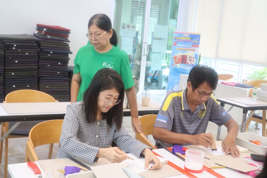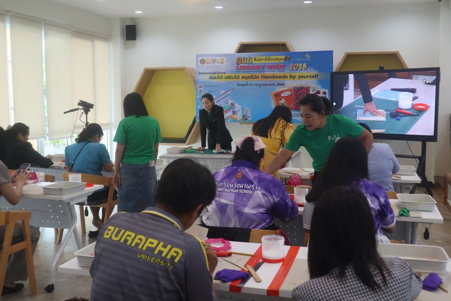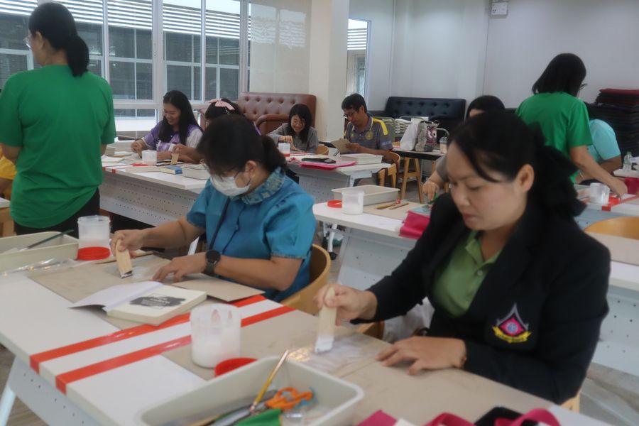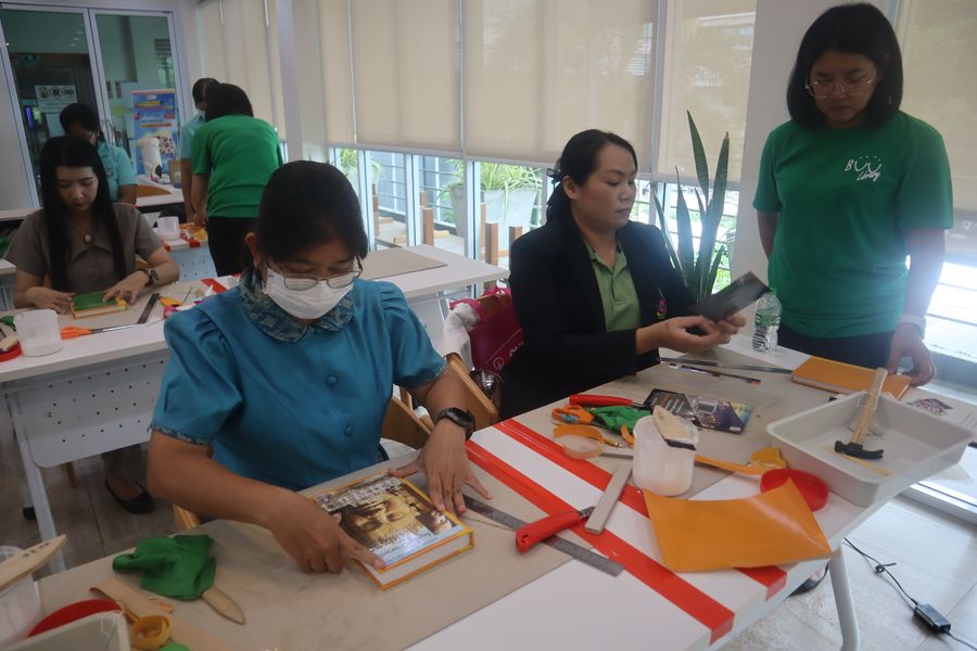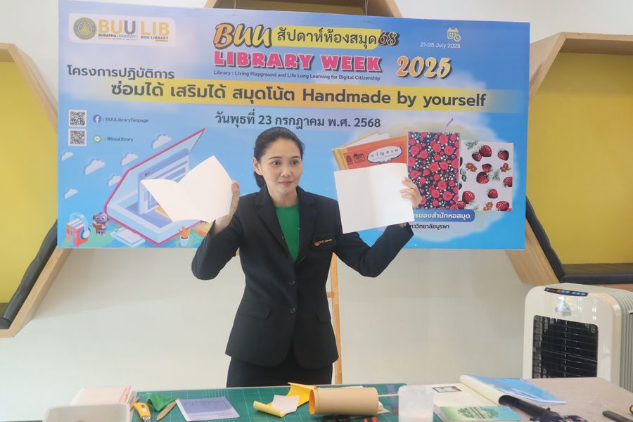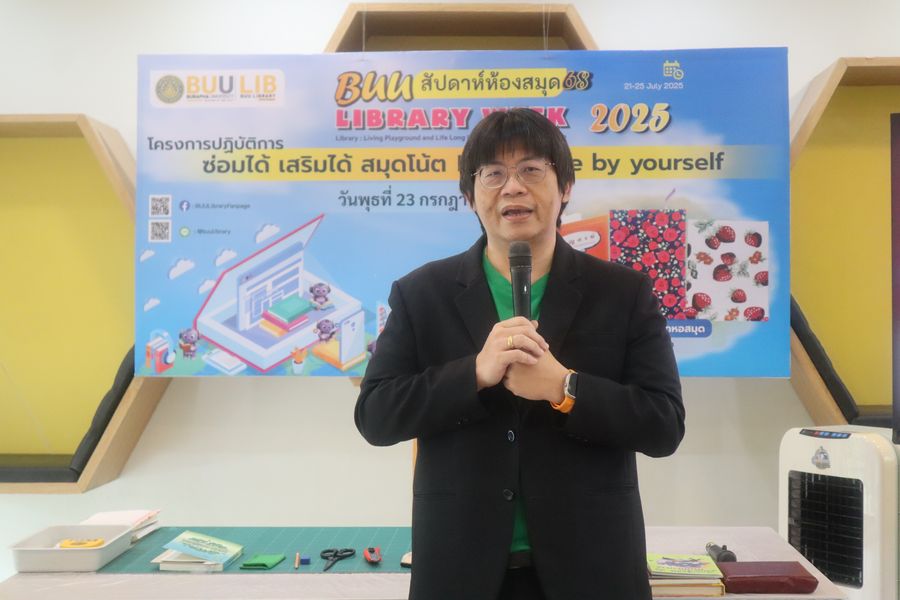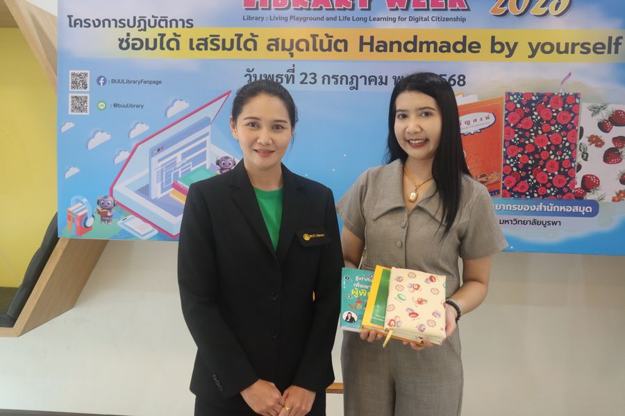 Burapha University Library, led by Mr. Hemmarat Wachirahattapong, the Director of the BUU Library, presided over the opening of the Workshop on “Repairable, Extendable: Handmade Notebook by Yourself.” The workshop was conducted by the library’s expert team from Burapha University. The event took place on July 23, 2025, at Khao Lam Game Zone on the 2nd floor at Lan Rommanee Building of the library.