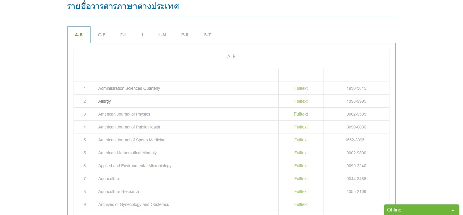 วารสารภาษาต่างประเทศที่สำนักหอสมุด มหาวิทยาลัยบูรพา บอกรับเป็นสมาชิกในรูปออนไลน์และฉบับพิมพ์ ประจำปี 2560 จำนวน 97 รายชื่อ
