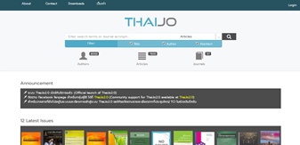 Thai Journals Online (ThaiJO) เป็นระบบฐานข้อมูลวารสารอิเล็กทรอนิกส์กลางของประเทศไทย เป็นแหล่งรวมวารสารวิชาการที่ผลิตในประเทศไทยทุกสาขาวิชา ทั้งสาขาวิทยาศาสตร์/เทคโนโลยี และมนุษยศาสตร์และสังคมศาสตร์