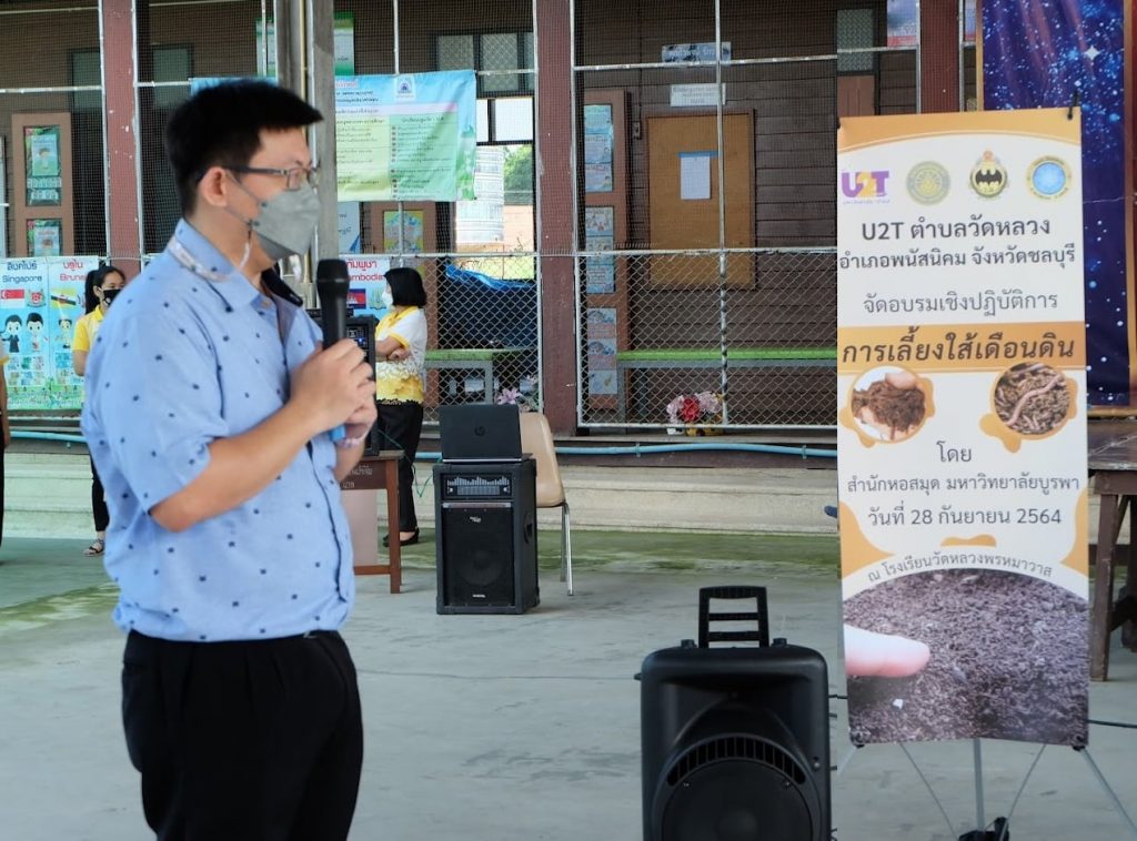 Lec. Hemmarat Wachirahatthapong, the Director of Burapha University Library, gave a speech at the opening of “Earthworm Raising” Workshop to develop and create a new career under Integrated Economic and Social Elevation Project for Sub-District (One Tambon One University (U2T)) together with the President of Wat Luang Sub-district Administrative Organization, the Director of Wat Luang Phrommawat School, speakers and personnels from Ban Kru Larn Sufficiency Economy Center who were honored to participate in the workshop and contribute earthworm raising learning center at at Wat Luang Phrommawat School, Wat Luang, Phanat Nikhom, Chonburi on 28 September 2021.