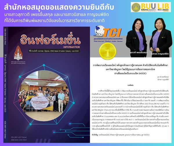 Congratulations to Miss Supawadee Petchuensakul and Miss Nisachon Kanchanapichit for having their research published in National Academic Journal Information (INFORMATION) Vol 30, No 1 (January – June 2023) TCI Database 1 on the topic of “Development of Online Courses on Information Literacy for Graduate Students at Burapha University Using the Massive Open Online Course (MOOC).