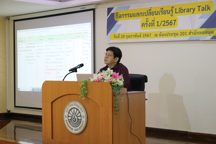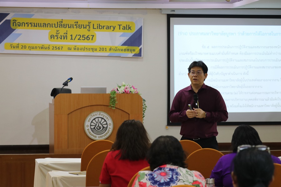 Burapha University Library led by Mr. Hemmarat Wachirahatthapong, the director of BUU library, presided over the opening of 1/2024 Library Talk Knowledge Exchange Activity and conveyed the library’s strategic plan to staff including exchange knowledge activity for librarians and information officer in Information and Reference Service in order to raise the level of service to maximum efficiency on 20 February 2024 at the meeting room 201 of the library.