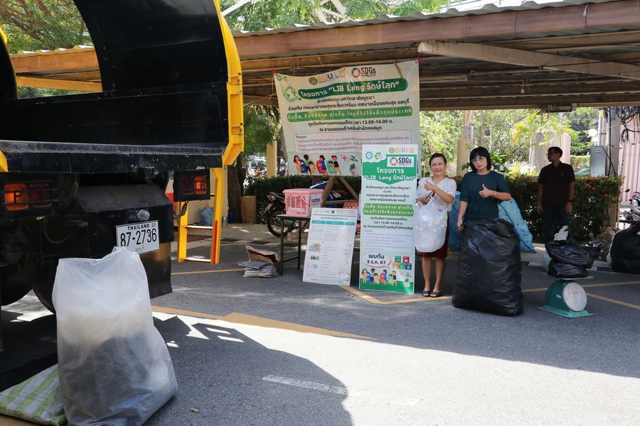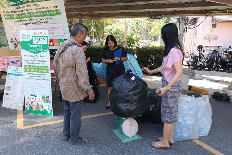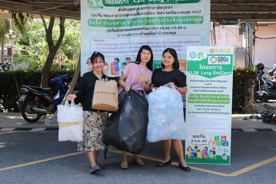 Burapha University Library, in collaboration with Saen Suk Municipality’s Division of Public Health and Environment, organized “LIB Leng Save the World” project. The initiative included a mobile unit for buying, accepting donations, and collecting all types of unused or discarded materials. The event took place on 3 December 2024 at the parking lot at the back of the library.
