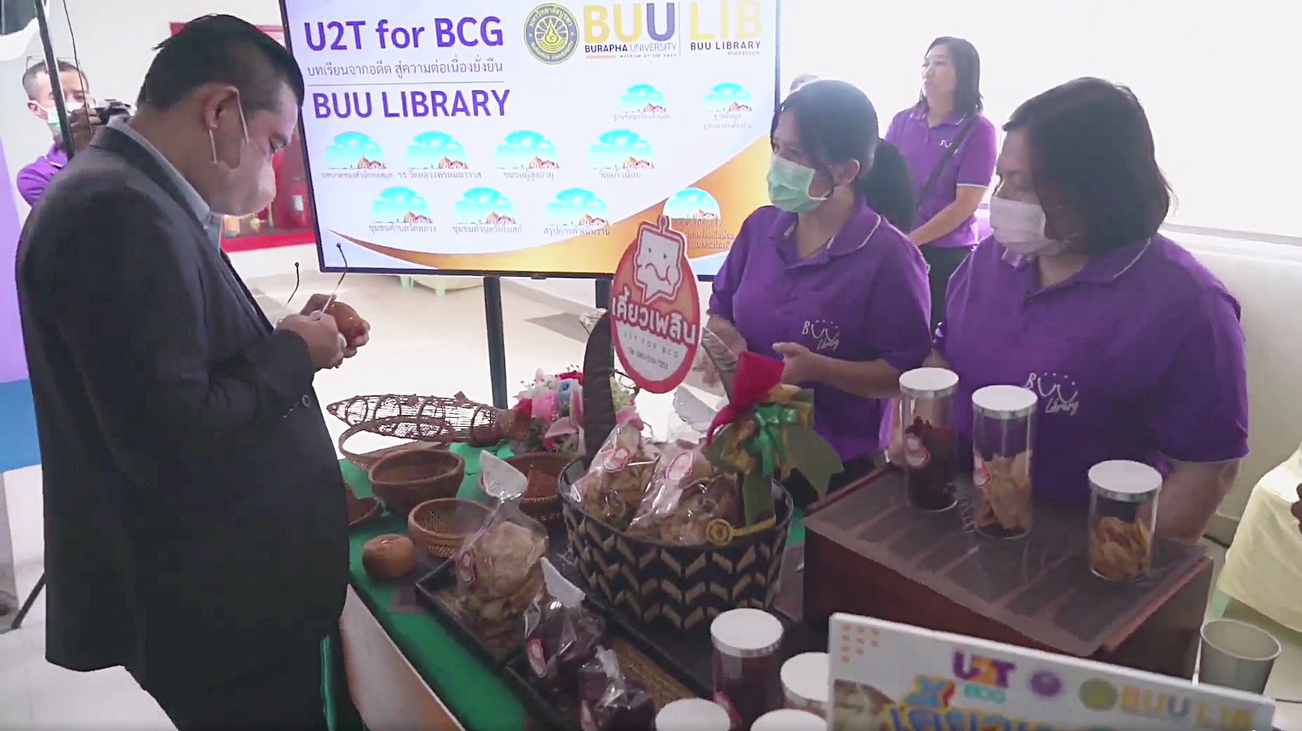 สำนักหอสมุด มหาวิทยาลัยบูรพา เข้าร่วมงานกิจกรรมถอดบทเรียน “U2T for BCG บทเรียนจากอดีต สู่ความต่อเนื่องยั่งยืน” โดย ดร.ดนุช ตันเทอดทิตย์ เลขานุการรัฐมนตรีว่าการกระทรวงอุดมศึกษา วิทยาศาสตร์ วิจัยและนวัตกรรม (อว.) เป็นประธานกล่าวเปิดโครงการส่งเสริมการตลาดเพื่อประชาสัมพันธ์และแนะนำผลิตภัณฑ์สินค้า U2T for BCG บทเรียนจากอดีต สู่ความต่อเนื่องยั่งยืน ซึ่งเป็นกิจกรรมภายใต้โครงการขับเคลื่อนเศรษฐกิจและสังคมฐานรากหลังโควิดด้วยเศรษฐกิจ BCG นอกจากนี้ สำนักหอสมุดยังได้ร่วมจัดตั้งบูธสินค้า/ ผลิตภัณฑ์ U2T มหาวิทยาลัยบูรพาและร่วม Live สด เพื่อแนะนำผลิตภัณฑ์ชุมชนตำบลวัดหลวงและตำบลวัดโบสถ์ที่นำมาจัดบูธ เมื่อวันพุธที่ 10 พฤษภาคม 2566 เวลา 13.00-16.30 น. ณ ห้องประชุมชั้น 11 อาคารคณะเภสัชศาสตร์ มหาวิทยาลัยบูรพา