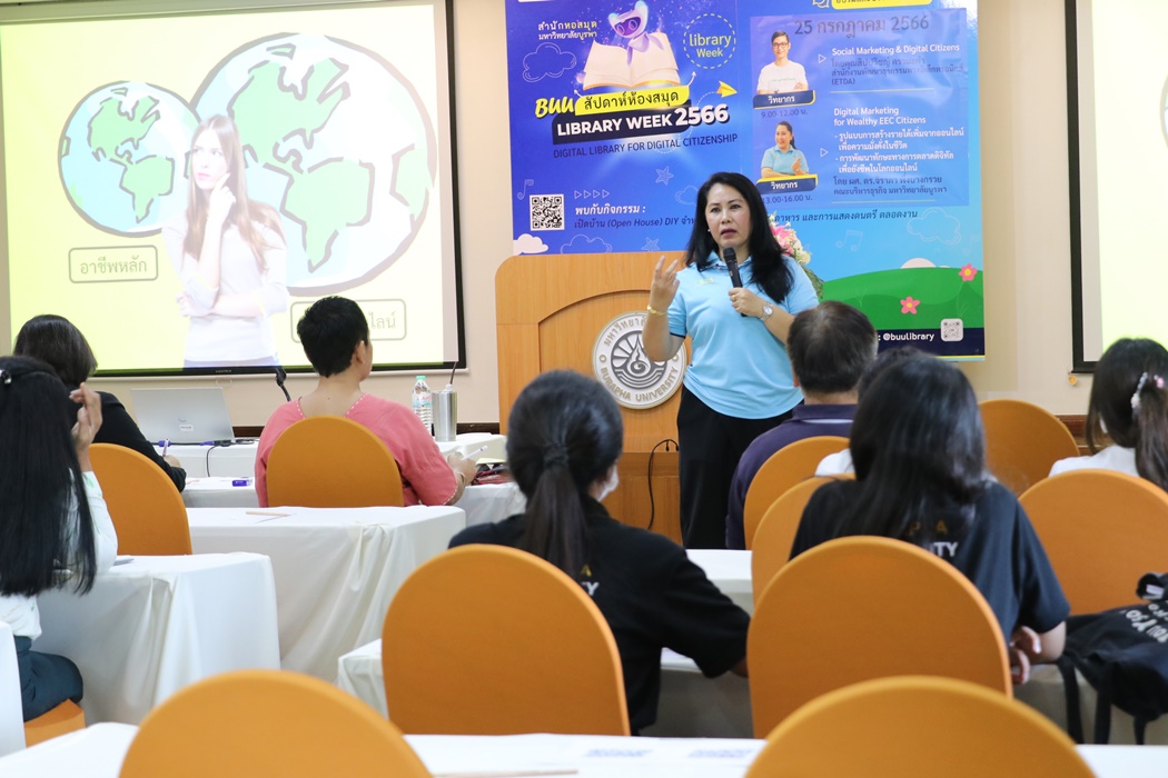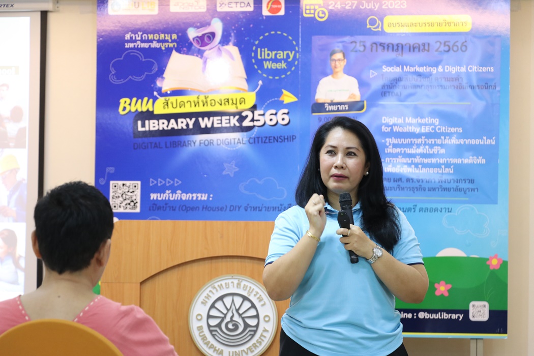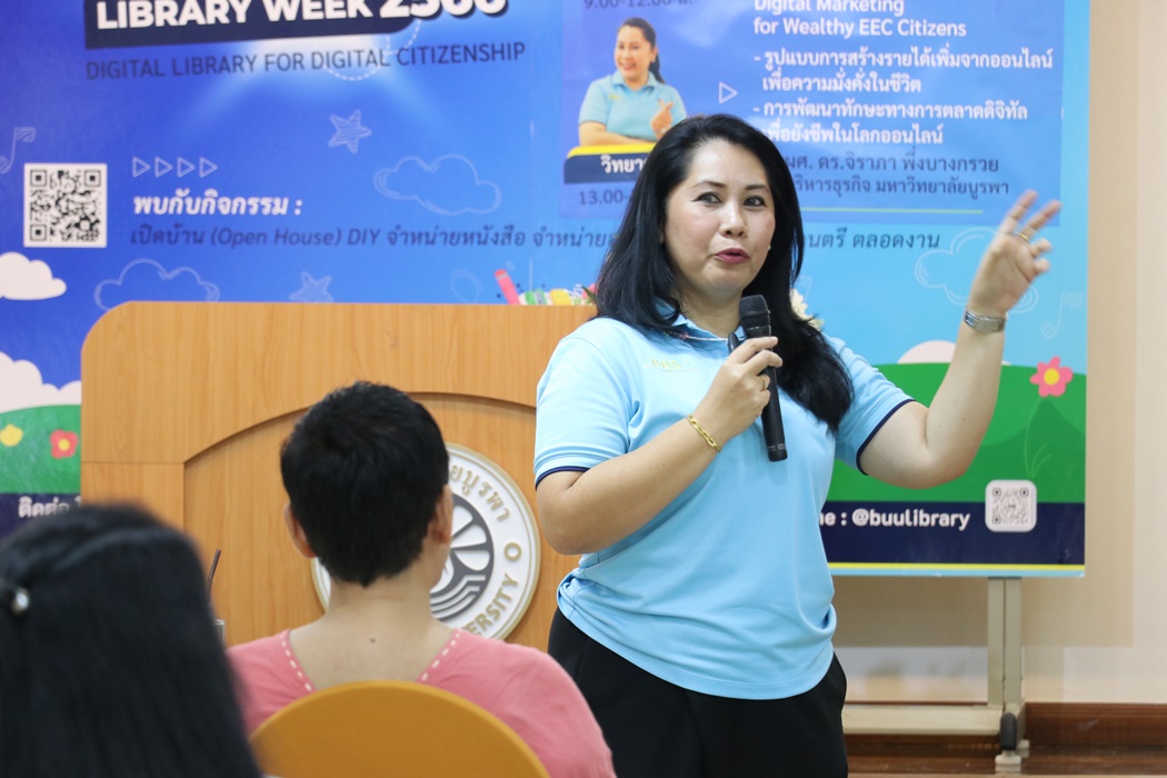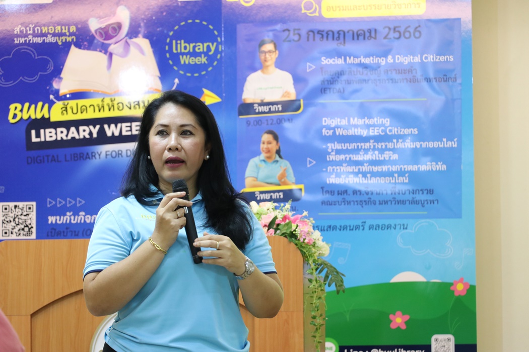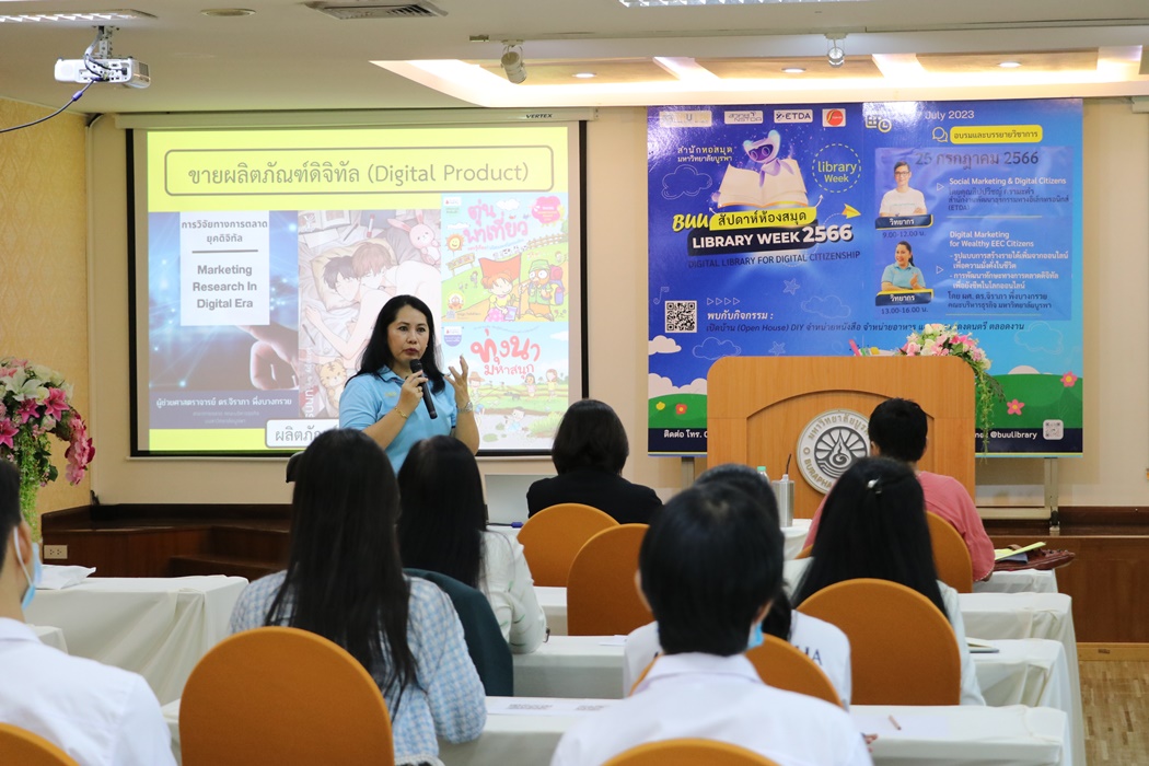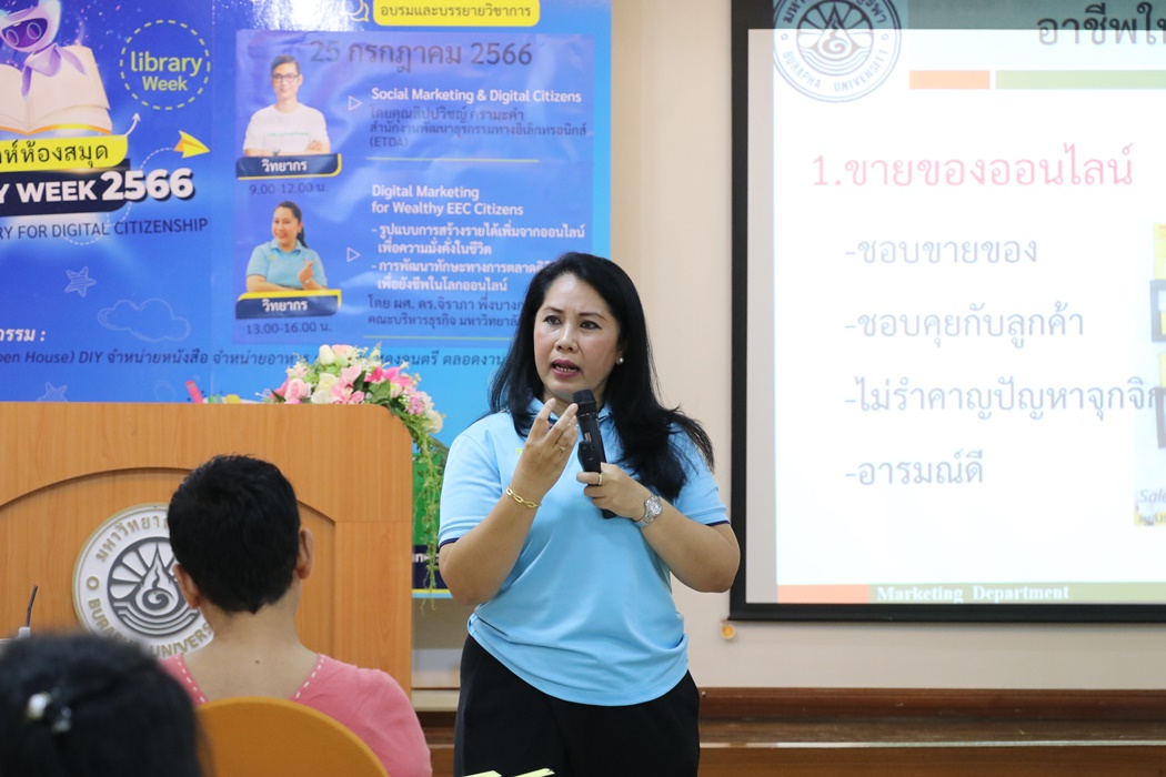 สำนักหอสมุด มหาวิทยาลัยบูรพา ได้จัดการบรรยายเรื่อง Digital Marketing for Wealthy EEC Citizens รูปแบบการสร้างรายได้เพิ่มจากออนไลน์เพื่อความมั่งคั่งในชีวิต ในงานสัปดาห์ห้องสมุด ประจำปี 2566 โดยวิทยากร ผู้ช่วยศาสตราจารย์ ดร.จิราภา พึ่งบางกรวย คณะบริหารธุรกิจ มหาวิทยาลัยบูรพา เมื่อวันที่ 25 กรกฎาคม 2566 เวลา 13.30-16.00 น. ณ ห้องประชุม 201 ชั้น 2 สำนักหอสมุด