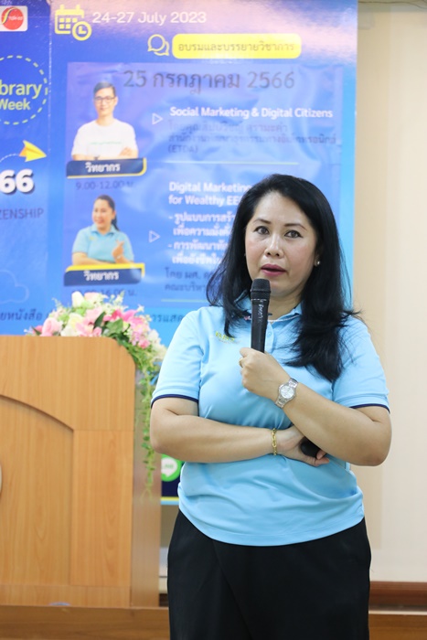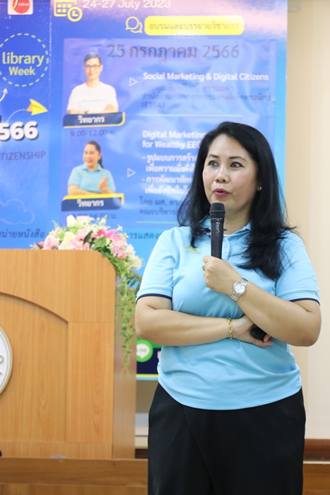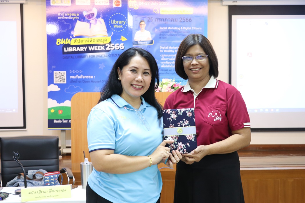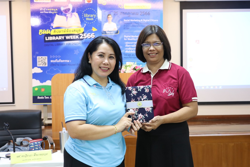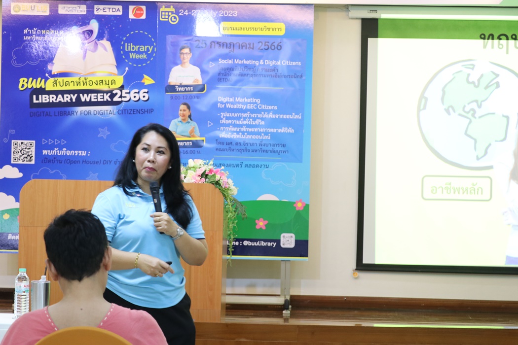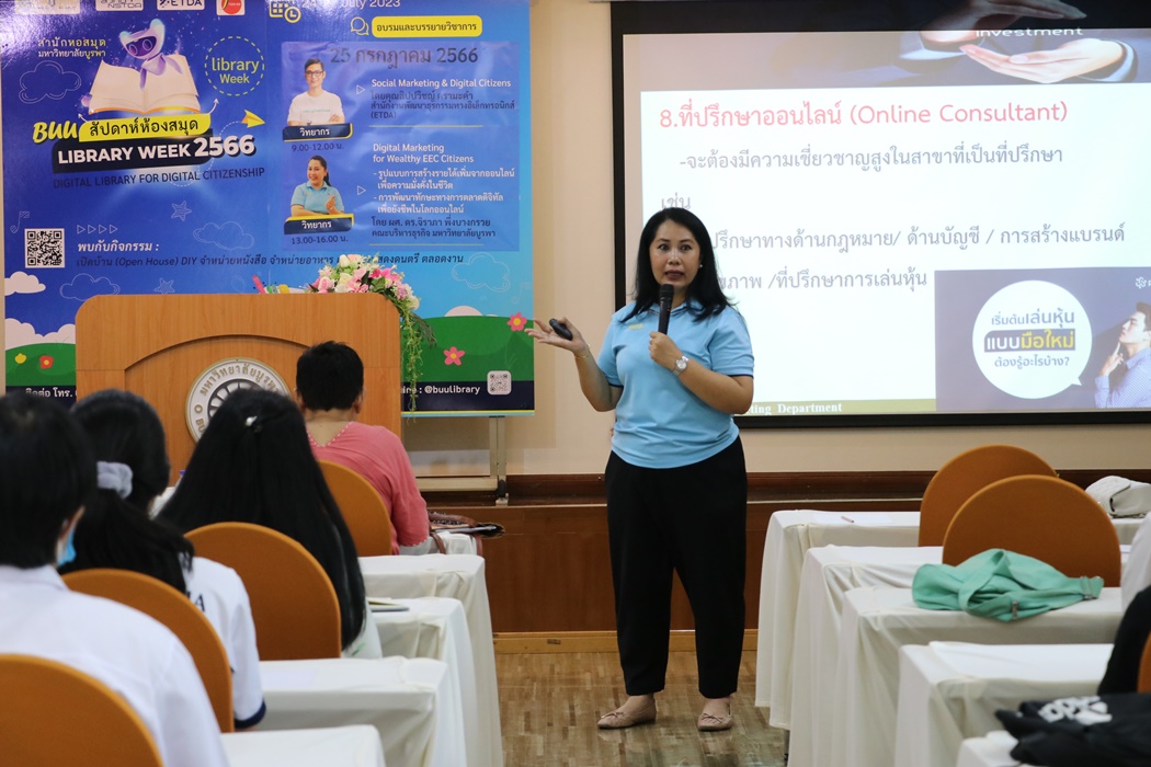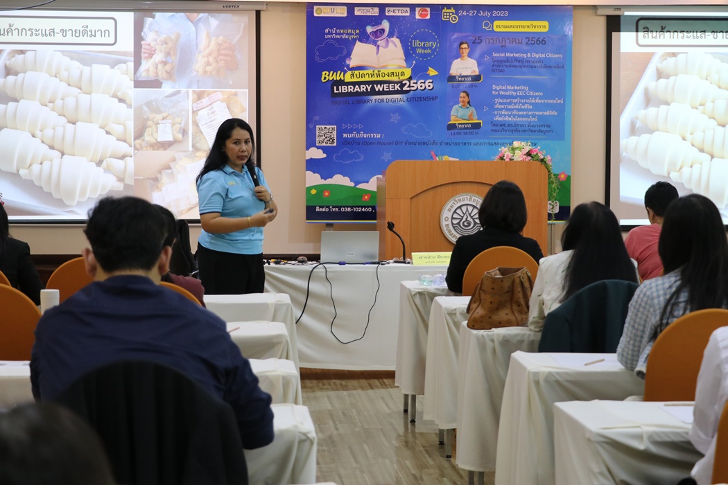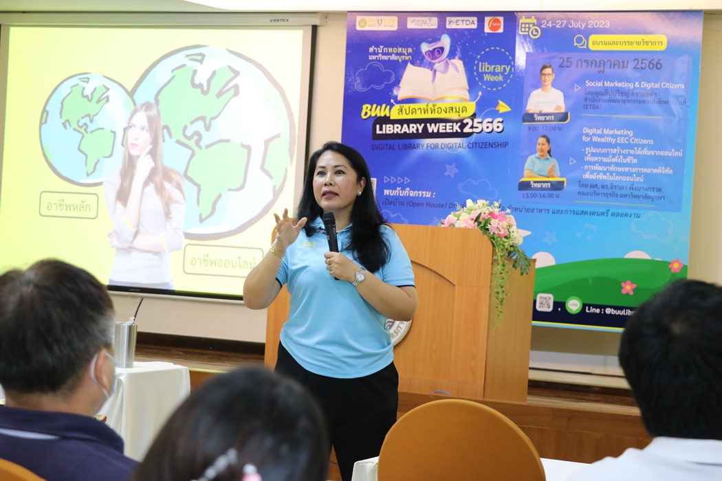 สำนักหอสมุด มหาวิทยาลัยบูรพา ได้จัดการบรรยายเรื่อง Digital Marketing for Wealthy EEC Citizens รูปแบบการสร้างรายได้เพิ่มจากออนไลน์เพื่อความมั่งคั่งในชีวิต ในงานสัปดาห์ห้องสมุด ประจำปี 2566 โดยวิทยากร ผู้ช่วยศาสตราจารย์ ดร.จิราภา พึ่งบางกรวย คณะบริหารธุรกิจ มหาวิทยาลัยบูรพา เมื่อวันที่ 25 กรกฎาคม 2566 เวลา 13.30-16.00 น. ณ ห้องประชุม 201 ชั้น 2 สำนักหอสมุด