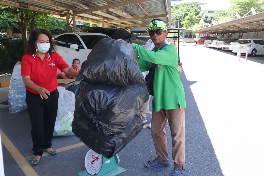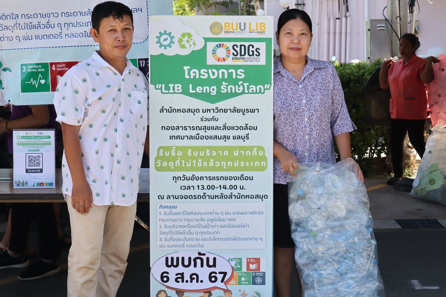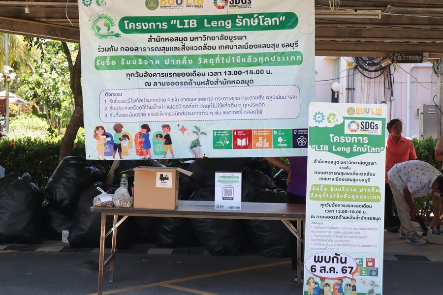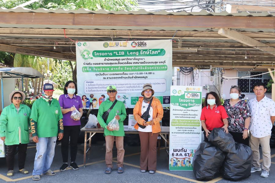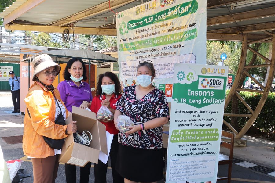 สำนักหอสมุด มหาวิทยาลัยบูรพา ร่วมกับกองสาธารณสุขและสิ่งแวดล้อม เทศบาลเมืองแสนสุข ยกขบวนมารับซื้อ รับบริจาค รับฝากทิ้งวัสดุที่ไม่ใช้แล้วทุกประเภท ในโครงการ LIB Leng