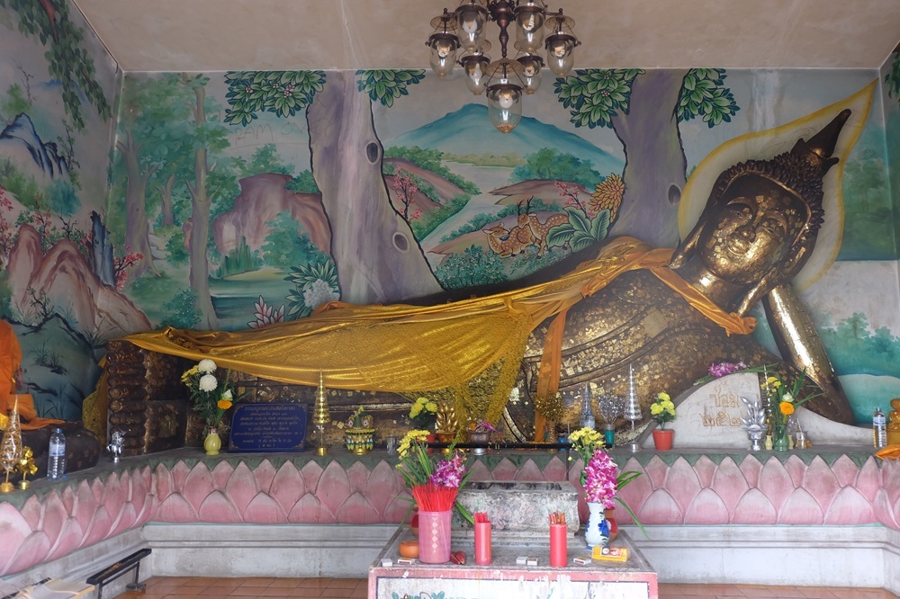 พระพุทธรูปนอน เป็นพระพุทธรูปปูนปั้นลงรักปิดทอง ตะแคงข้างซ้าย หันพระเศียรไปทางทิศตะวันออก วิหารและองค์พระเป็นของใหม่ที่มีพุทธลักษณะโดยรวมแสดงให้เห็นถึงฝีมือช่างท้องถิ่นกำหนดอายุได้ในราวพุทธศตวรรษที่ ๒๕ และจากสอบถามพบว่าผู้สร้าง คือ เล่ากงเหม็ง ตระกูลศรีตลานนท์ เจ้าของโรงปูนอยู่หน้าวัดเขาบางทราย ปัจจุบันมีเก๋งบรรจุอัฐิของท่านและครอบครัวอยู่ทางด้านหน้าของวิหารพระนอน